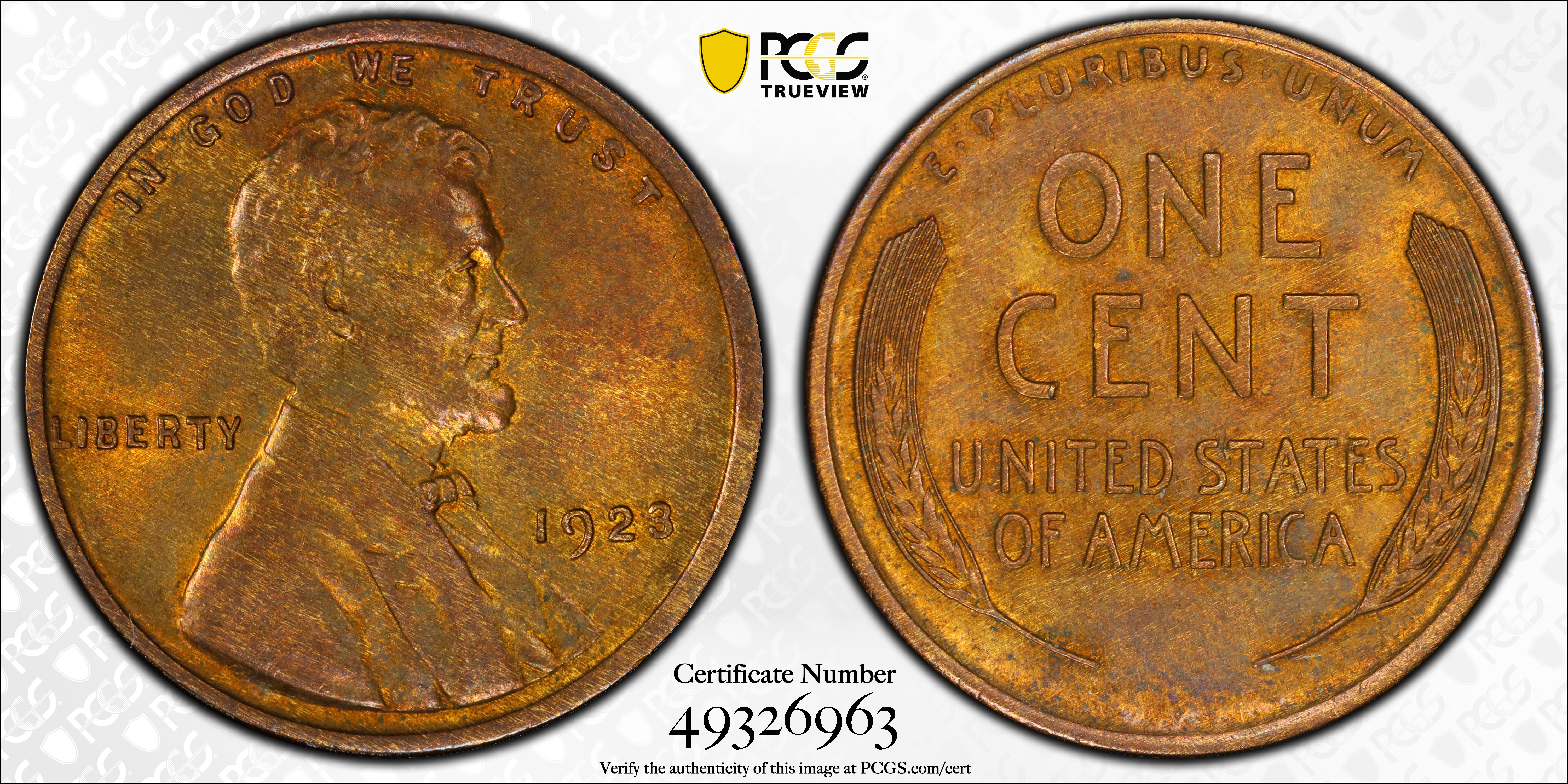 1923 1C, BN MS63BN Certification #49326963, PCGS #2543