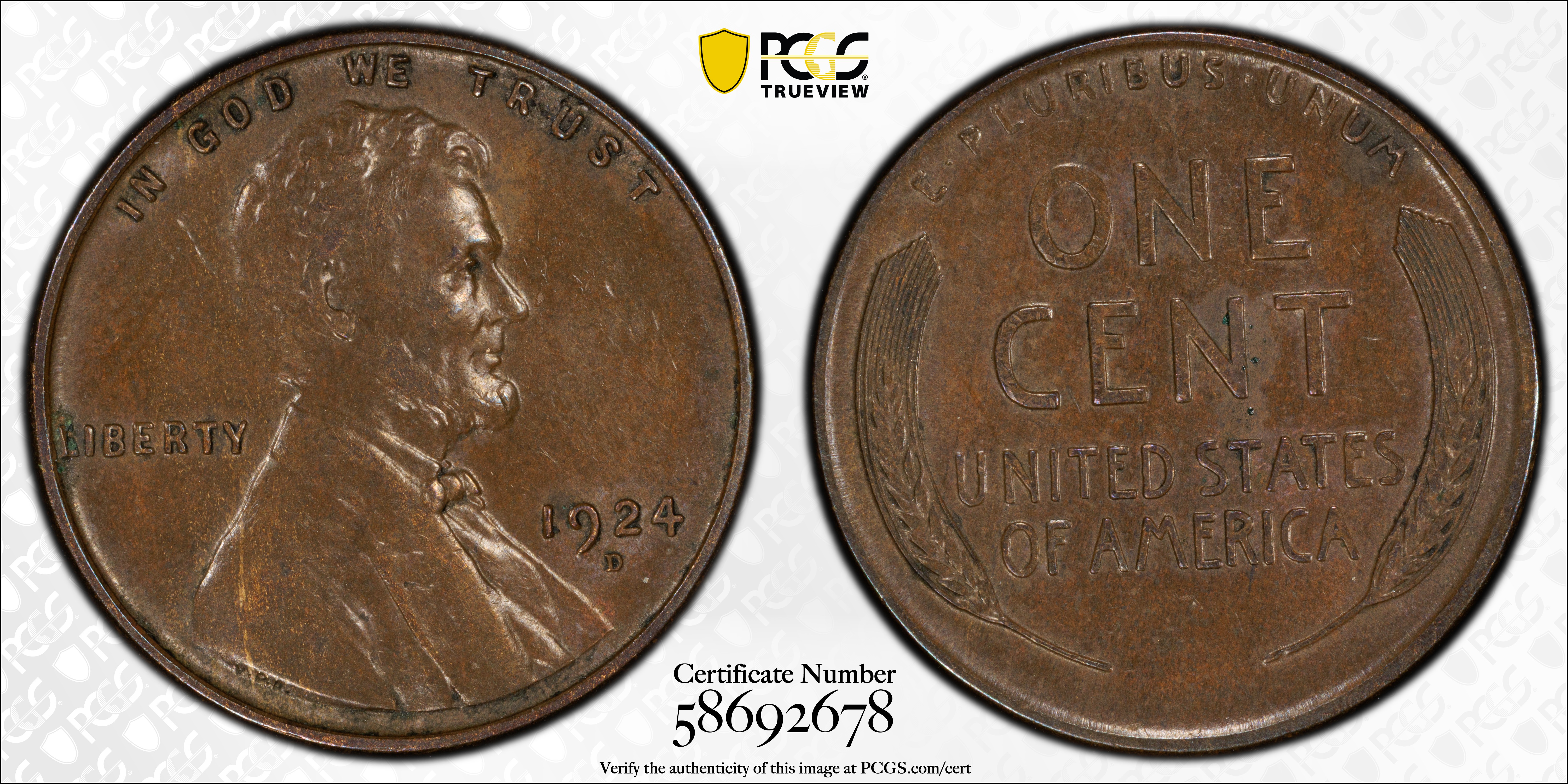 1924-D 1C, BN AU55BN Certification #58692678, PCGS #2552