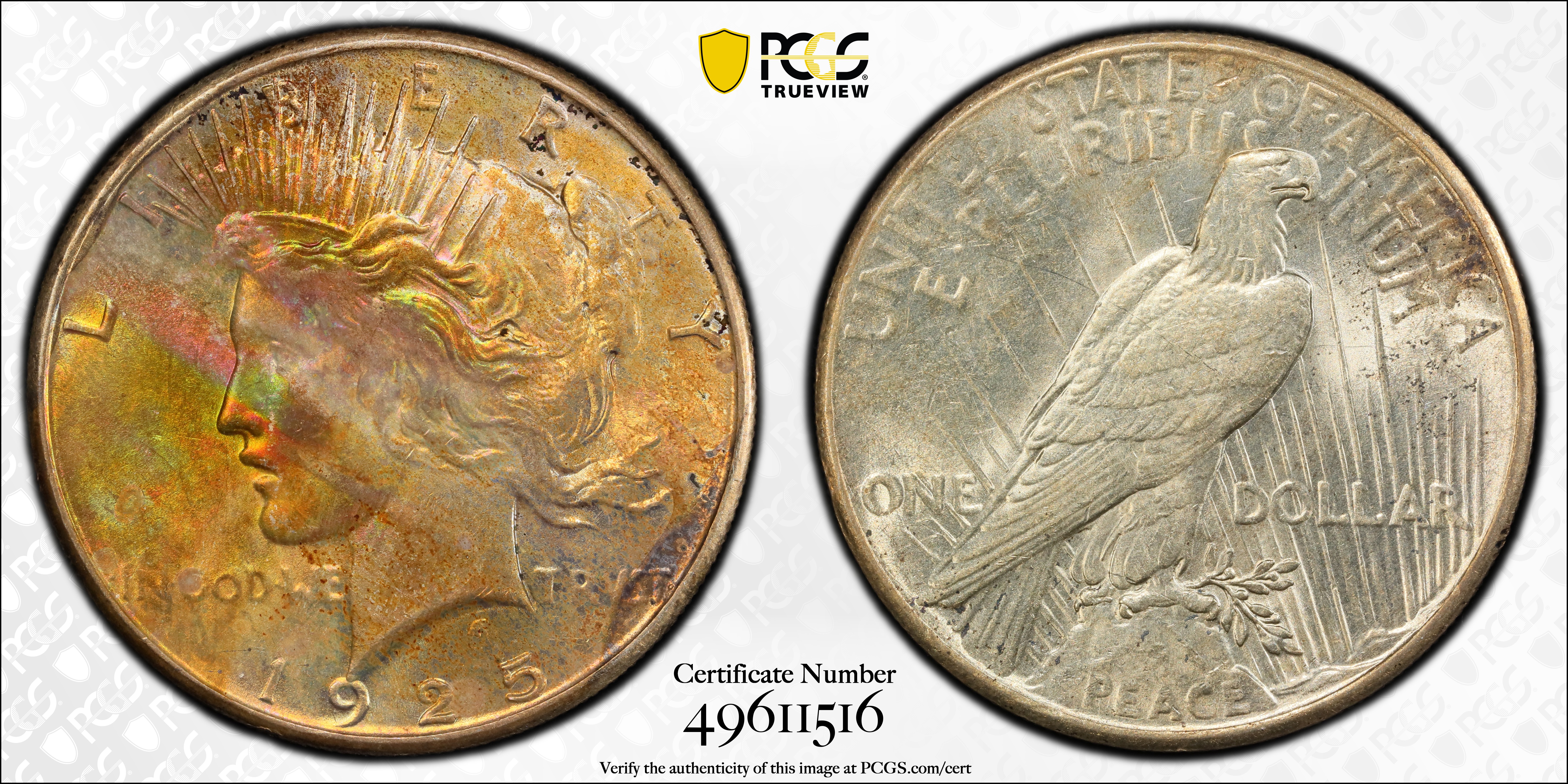 This and the 1922, 1923, and 1924 Philadelphia Mint issues constitute the four most common Philadelphia Mint Peace silver dollars. In high Mint State grades the 1925 is the most plentiful Peace dollar.