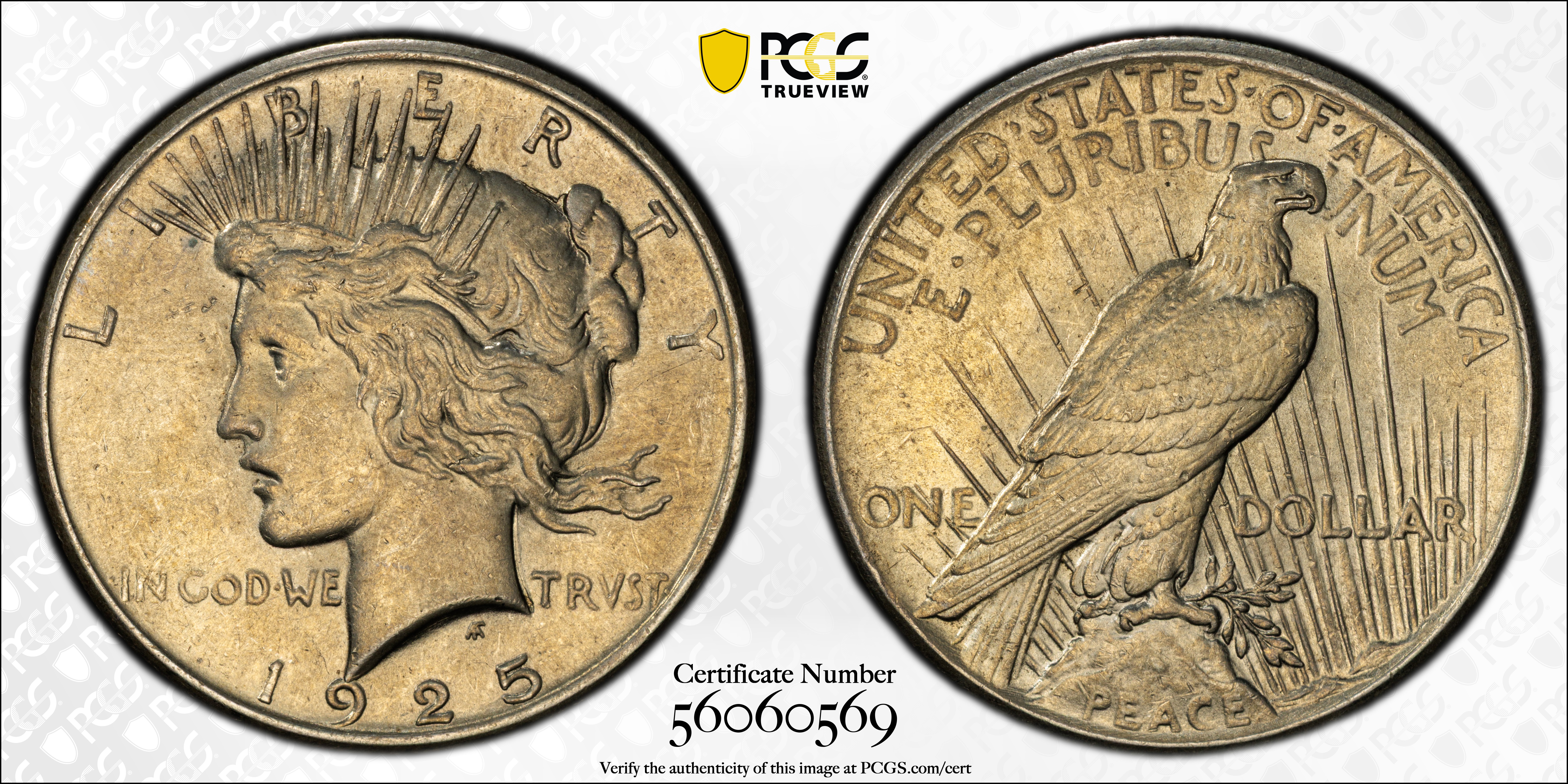This and the 1922, 1923, and 1924 Philadelphia Mint issues constitute the four most common Philadelphia Mint Peace silver dollars. In high Mint State grades the 1925 is the most plentiful Peace dollar.
