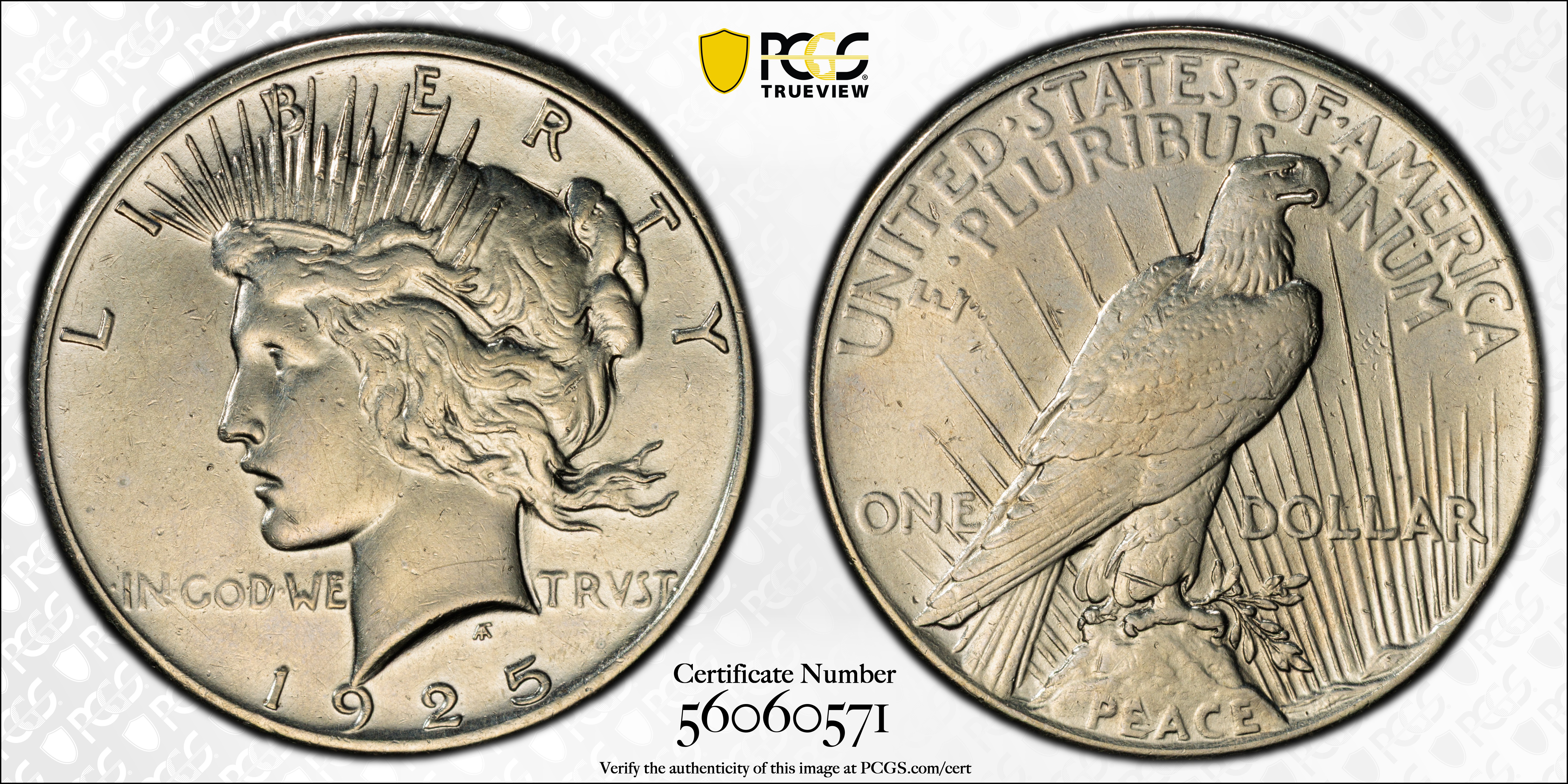 This and the 1922, 1923, and 1924 Philadelphia Mint issues constitute the four most common Philadelphia Mint Peace silver dollars. In high Mint State grades the 1925 is the most plentiful Peace dollar.