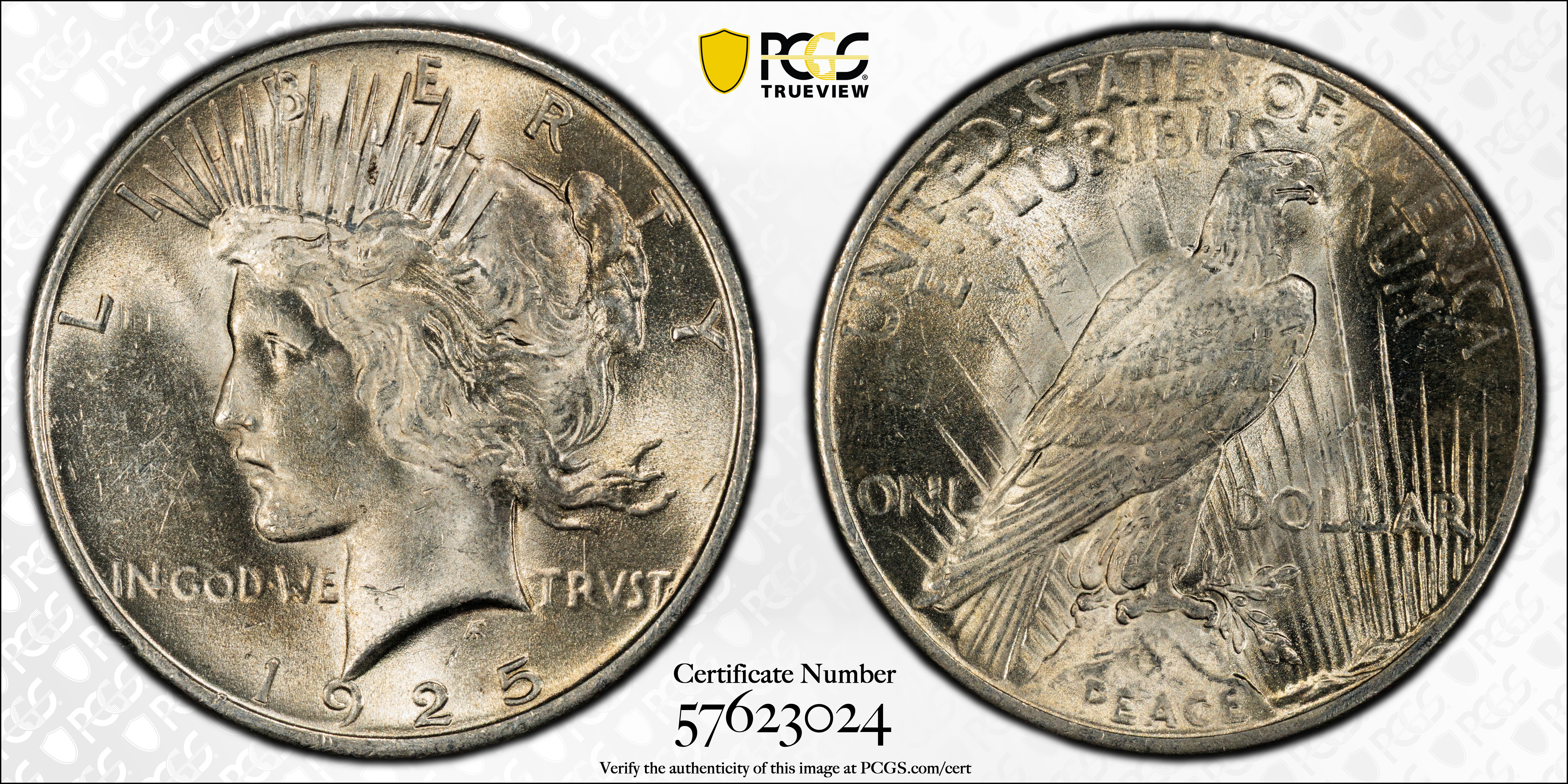 This and the 1922, 1923, and 1924 Philadelphia Mint issues constitute the four most common Philadelphia Mint Peace silver dollars. In high Mint State grades the 1925 is the most plentiful Peace dollar.
