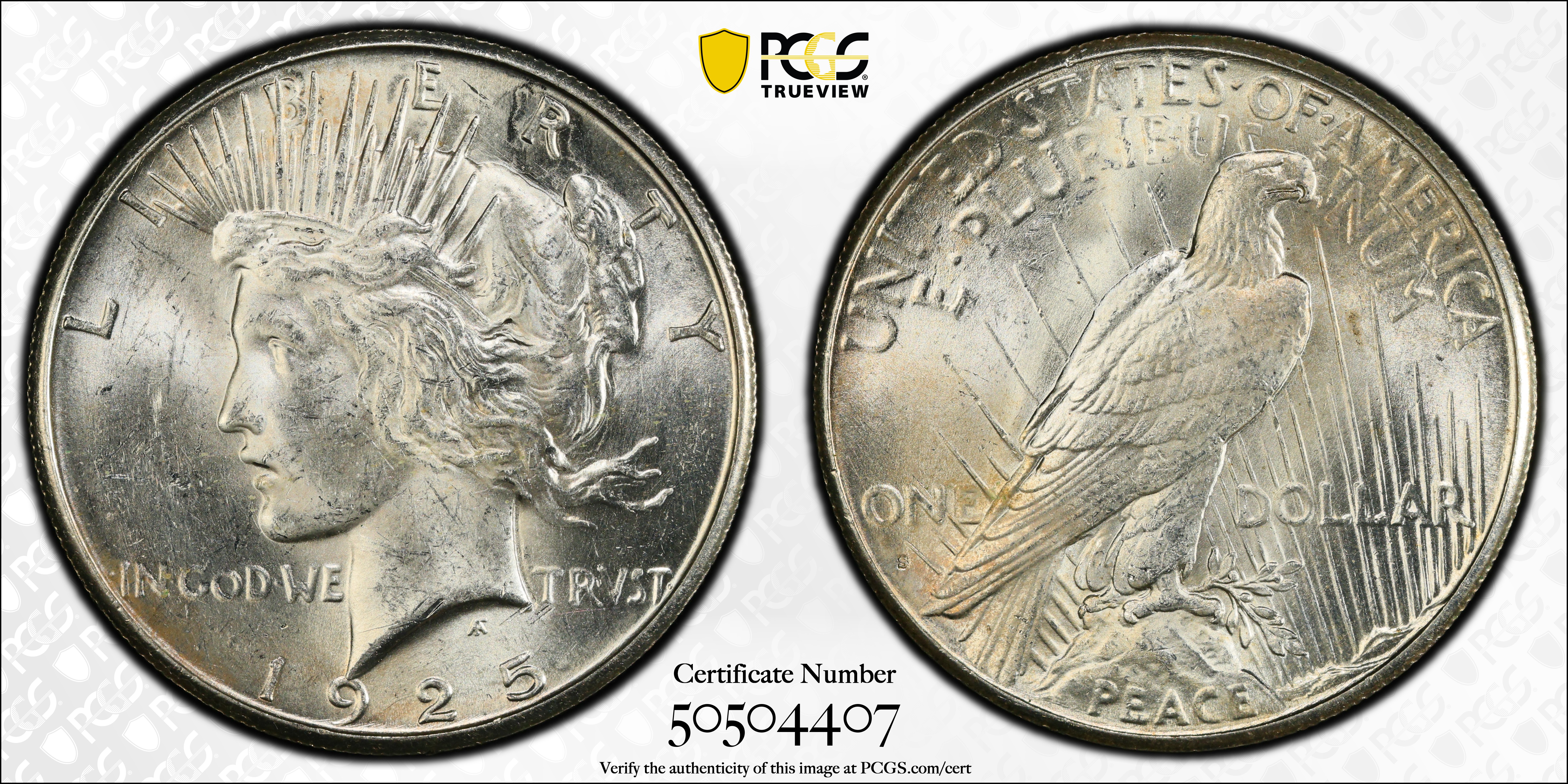 Mint State grades: Uncirculated 1925-S dollars are much more plentiful than 1924-S, despite the lower mintage of 1925-S. However, in MS-65 grade, the 1925-S is surprisingly rare. Indeed, it and the 1928-S are the two toughest varieties to find in this grade in the entire Peace dollar series.