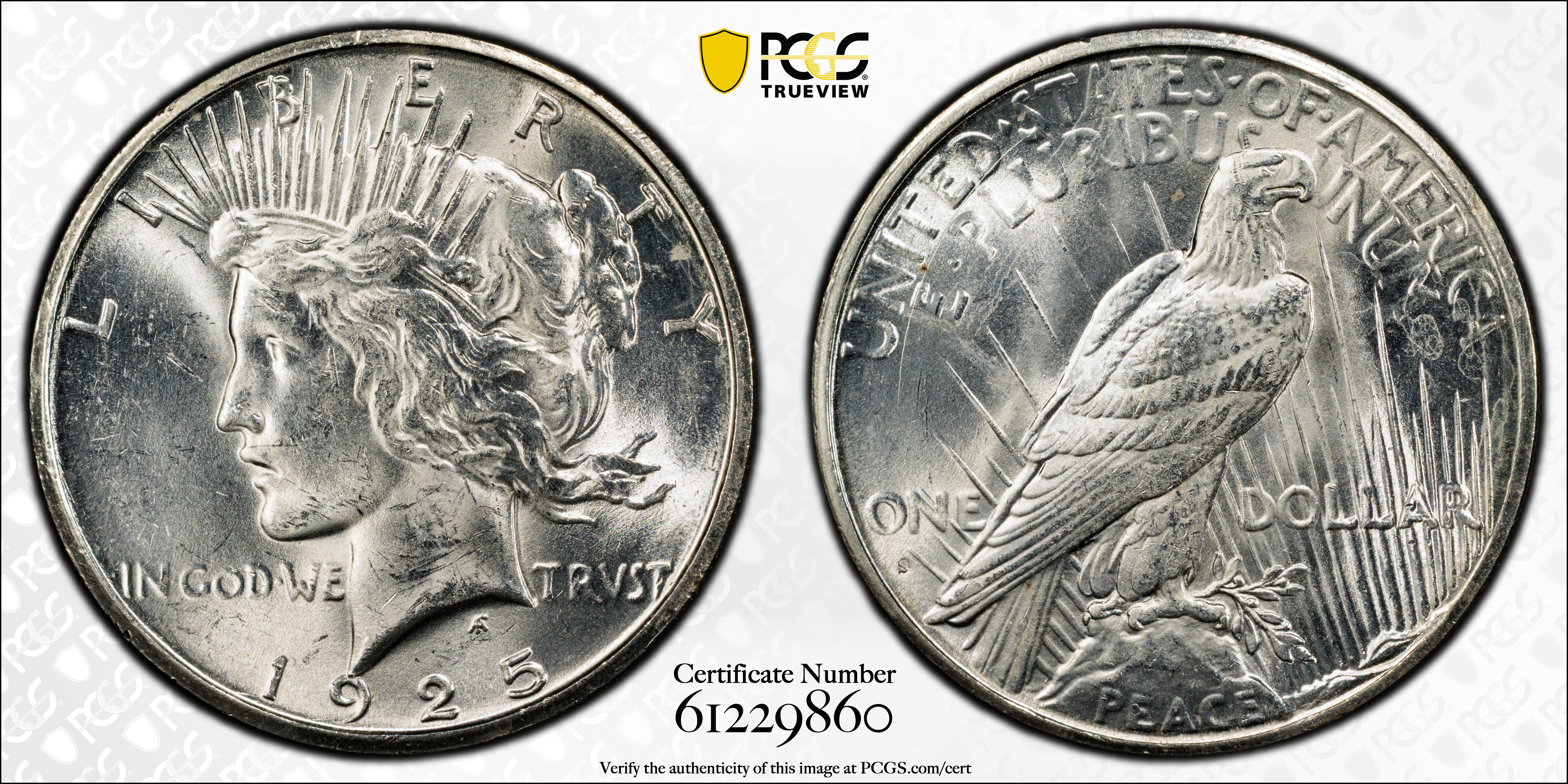 Mint State grades: Uncirculated 1925-S dollars are much more plentiful than 1924-S, despite the lower mintage of 1925-S. However, in MS-65 grade, the 1925-S is surprisingly rare. Indeed, it and the 1928-S are the two toughest varieties to find in this grade in the entire Peace dollar series.