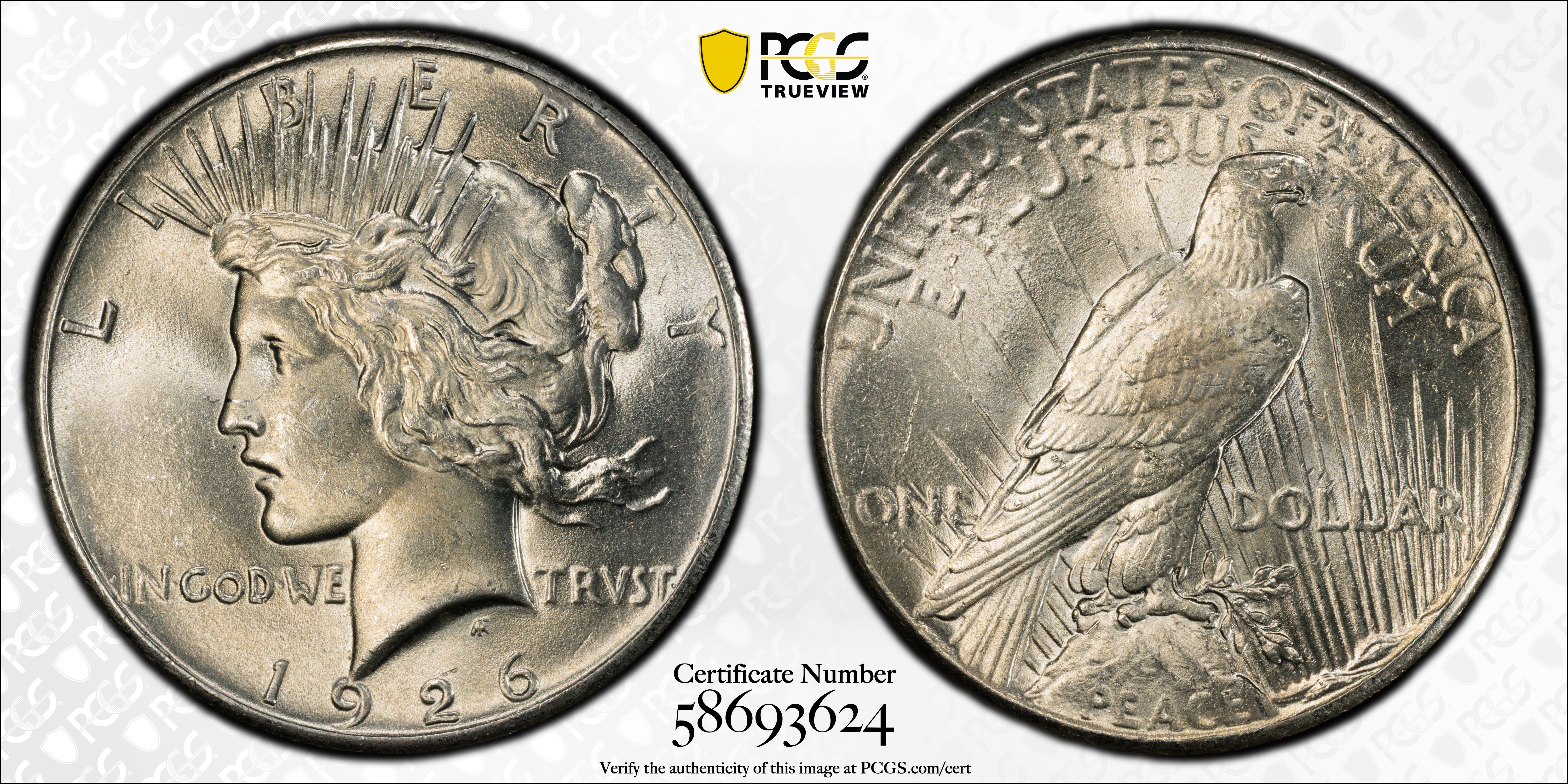 In 1926, the output of Silver Dollars at the Philadelphia mint dropped to less than a fifth of the previous year. For that reason alone, some collectors think the 1926 is scarce or worth a premium. In general it is not. Certainly, the population of certified Mint State examples is lower than in 1925, but not to the point where collectors are unable to find nice examples. In fact, thousand of MS-63 and MS-64 examples have been certified by PCGS and even in MS-65, this date is readiuly available. However, in MS-66, the population drops off dramatically and absolutely none have been graded finer by PCGS. Although strike varies, this date can be found with full details and a strong strike. Luster ranges from frosty to brilliant. Collectors seeking quality 1926 Peace Dollars should have no trouble finding nice-looking, well struck examples with a minimum of marks. Anything less should be avoided or discounted.