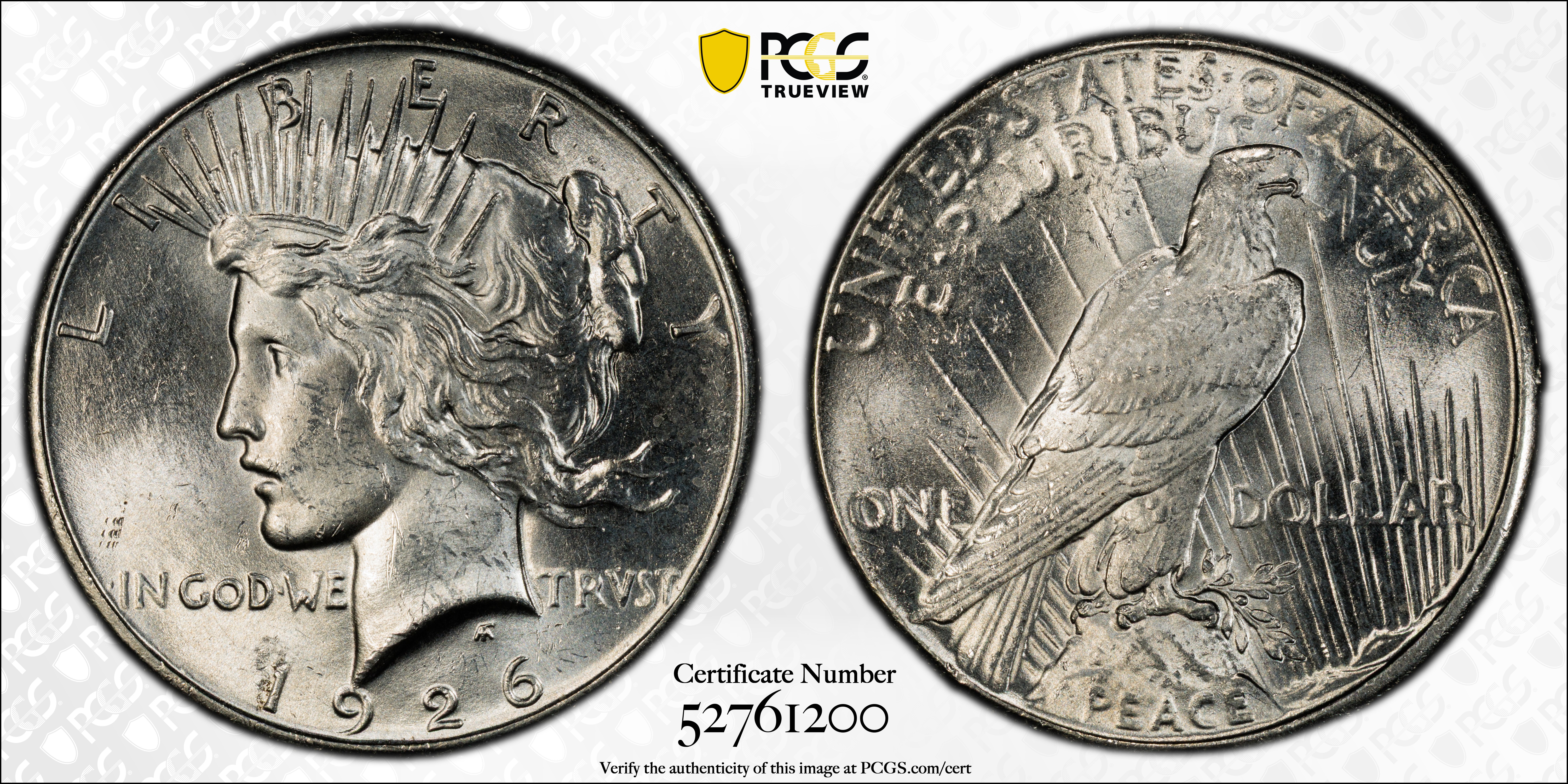 In 1926, the output of Silver Dollars at the Philadelphia mint dropped to less than a fifth of the previous year. For that reason alone, some collectors think the 1926 is scarce or worth a premium. In general it is not. Certainly, the population of certified Mint State examples is lower than in 1925, but not to the point where collectors are unable to find nice examples. In fact, thousand of MS-63 and MS-64 examples have been certified by PCGS and even in MS-65, this date is readiuly available. However, in MS-66, the population drops off dramatically and absolutely none have been graded finer by PCGS. Although strike varies, this date can be found with full details and a strong strike. Luster ranges from frosty to brilliant. Collectors seeking quality 1926 Peace Dollars should have no trouble finding nice-looking, well struck examples with a minimum of marks. Anything less should be avoided or discounted.