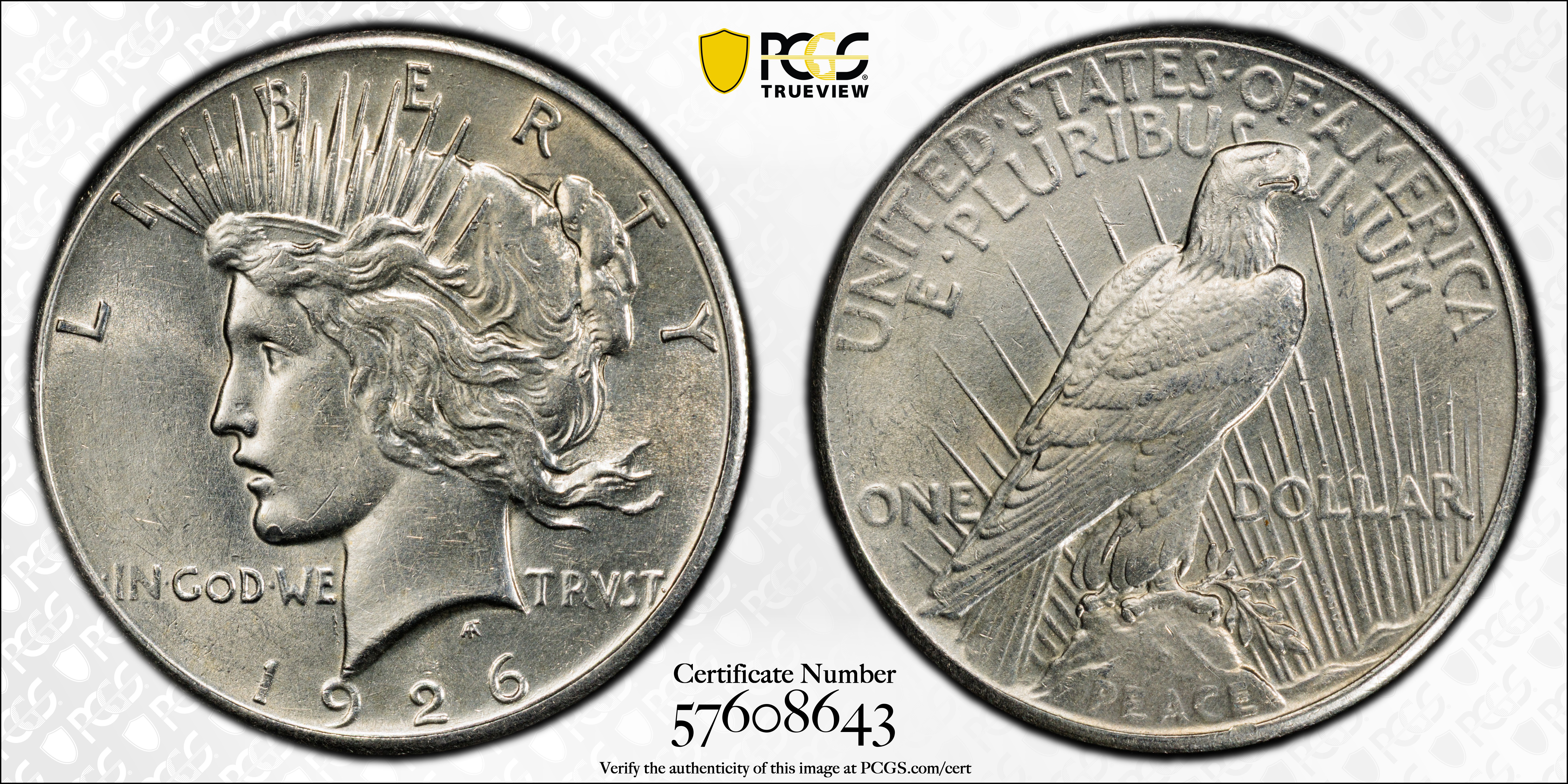 In 1926, the output of Silver Dollars at the Philadelphia mint dropped to less than a fifth of the previous year. For that reason alone, some collectors think the 1926 is scarce or worth a premium. In general it is not. Certainly, the population of certified Mint State examples is lower than in 1925, but not to the point where collectors are unable to find nice examples. In fact, thousand of MS-63 and MS-64 examples have been certified by PCGS and even in MS-65, this date is readiuly available. However, in MS-66, the population drops off dramatically and absolutely none have been graded finer by PCGS. Although strike varies, this date can be found with full details and a strong strike. Luster ranges from frosty to brilliant. Collectors seeking quality 1926 Peace Dollars should have no trouble finding nice-looking, well struck examples with a minimum of marks. Anything less should be avoided or discounted.
