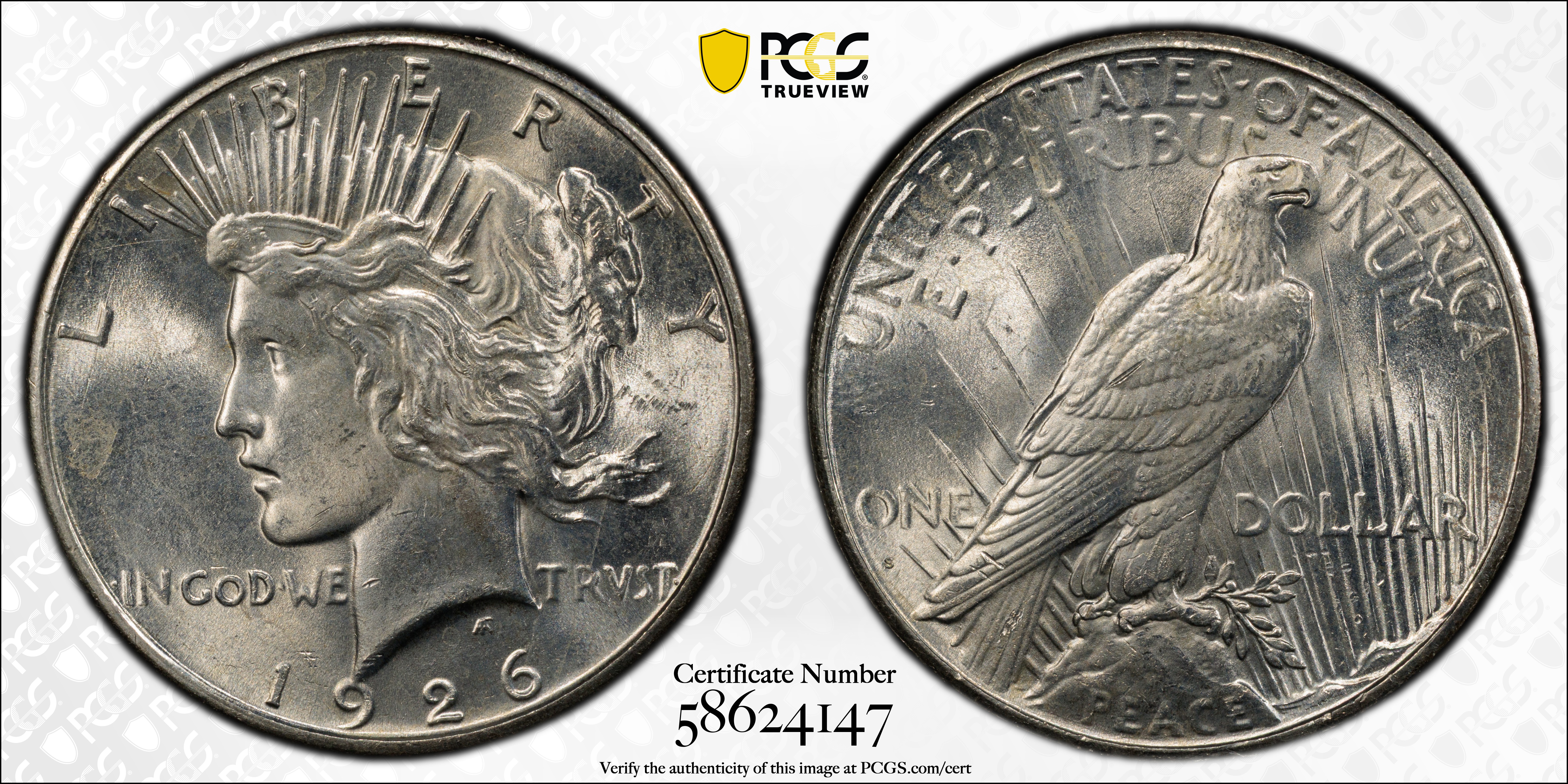 The 1926-S Peace Dollar is a relatively common coin and it is the only one of the S-Mint Peace Dollars that can be found with a good strike. The mintage was nearly 7 million coins, making this the last of the Peace Dollars with a mintage of over 2 million pieces. Most of the certified Mint State examples fall into the MS-63 and MS-64 categories, with about equal distribution between the two grades. MS-65 examples are fairly plentiful, but the population drops off a cliff in the MS-66. In MS-67, the 1926-S Peace Dollar is a true condition-rarity, and none have been graded finer by PCGS. Luster ranges from frosty to brilliant; several of the top examples have bright, booming luster. Often the eye appeal is diminished by bagmarks, but when clean examples are found, they are very attractive.