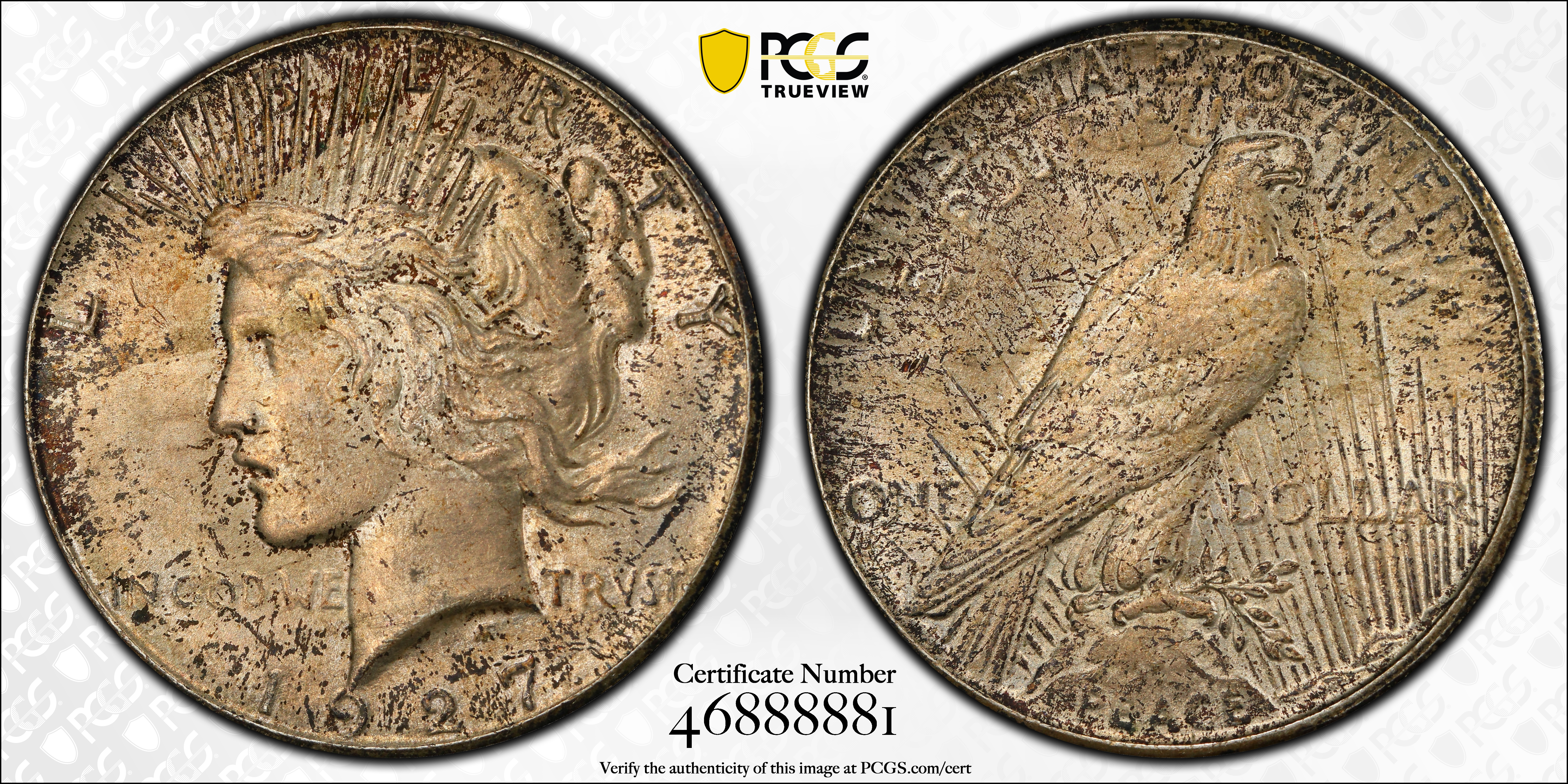 The usually-seen Uncirculated 1927 is very attractive, well struck, and with lustrous, satiny surfaces a numismatic gem to behold. There are exceptions as there always seem to be among Peace silver dollars-and some are average strikes and/or are noticeably bagmarked.