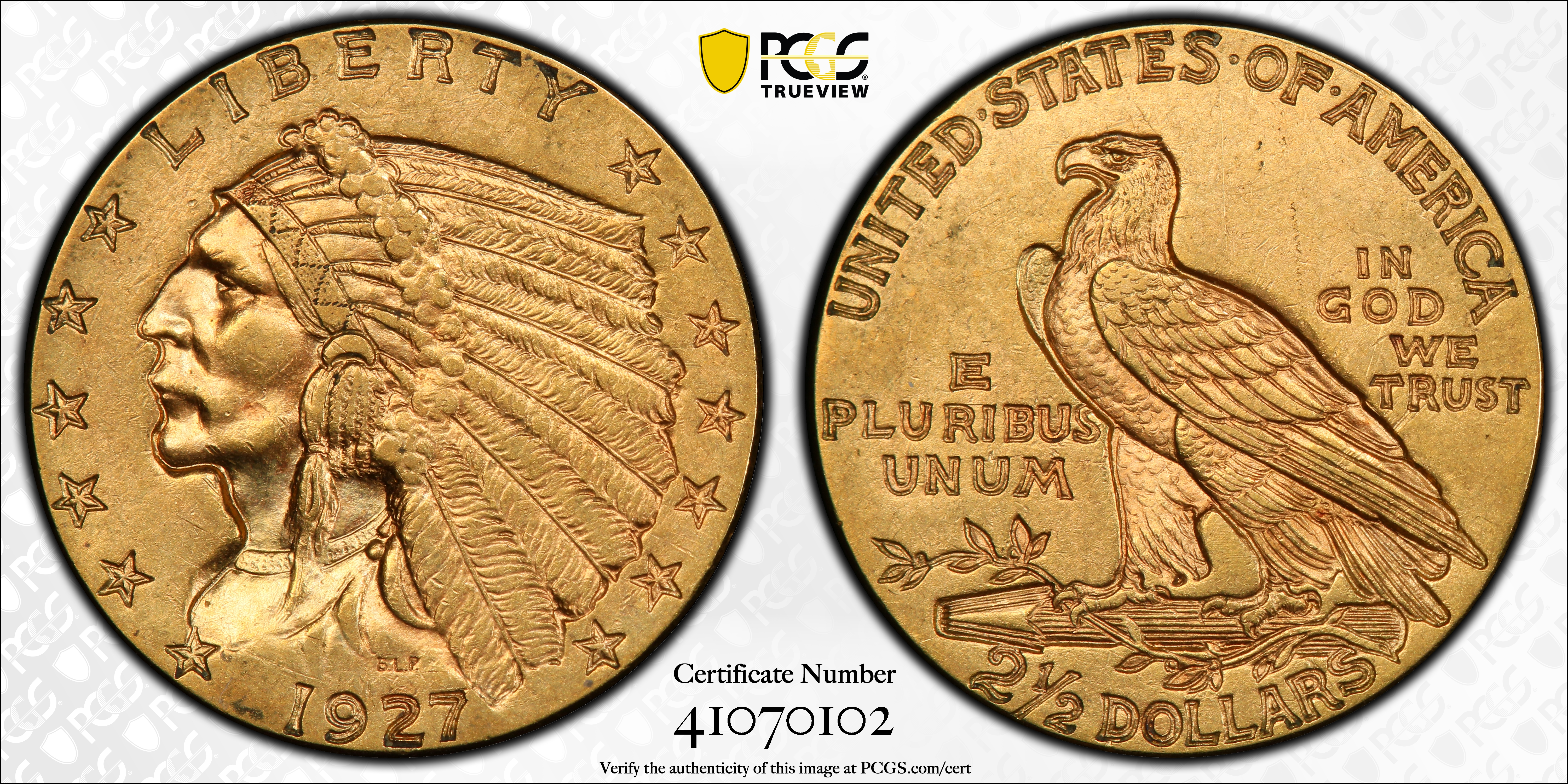 The 1927 is similar in overall rarity to the 1926 and can be obtained without much difficulty in MS-65 or lower condition. Gem quality specimens are available from time to time but certainly cannot be found in any great quantity. As with all the Pratt $2.5 and $5 issues, there is a dramatic drop-off in availability above MS-65 condition, and, for all practical purposes, superb quality examples, although they certainly do exist, are virtually unobtainable.Like the 1926 and the other late Philadelphia Mint issues, the 1927 is usually very well struck with very good lustre and color. The color is similar to the 1926; that is, specimens range from light rose gold to a richer greenish gold. Along with the 1926, this issue is generally the most attractive of the series in high grade.