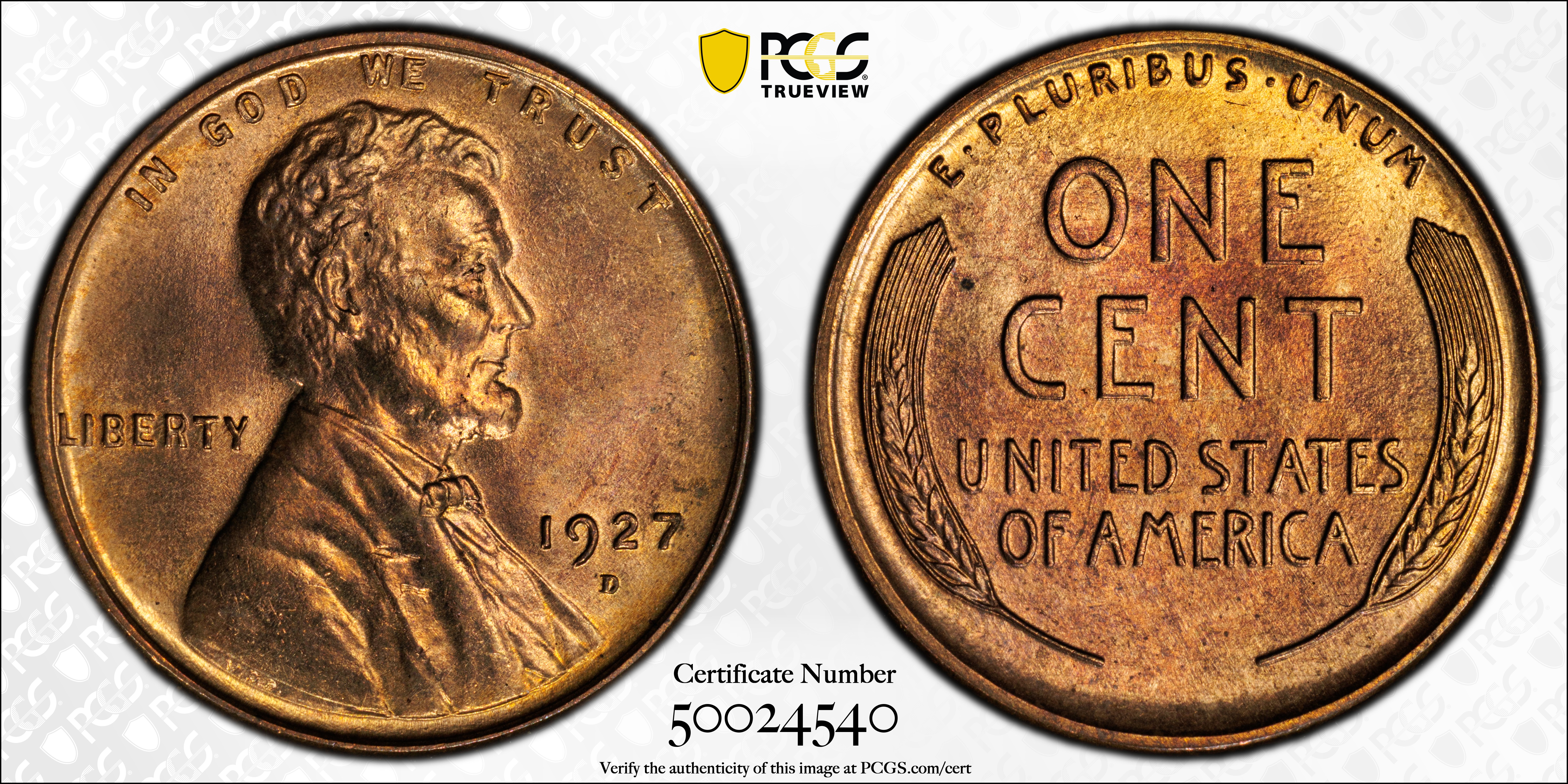1927-D 1C, RD MS65RD Certification #50024540, PCGS #2581
