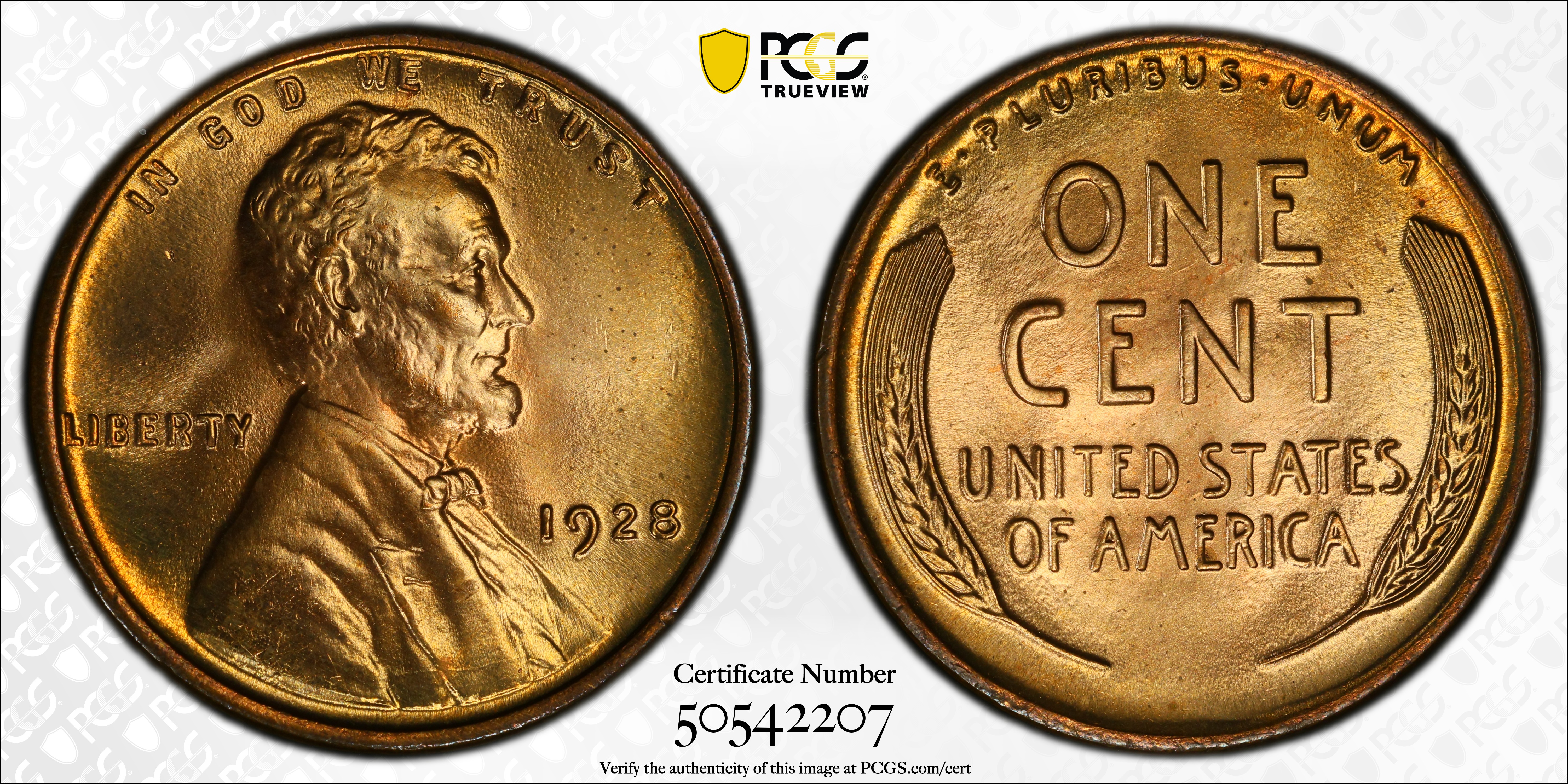 1928 1C, RD MS67RD Certification #50542207, PCGS #2587