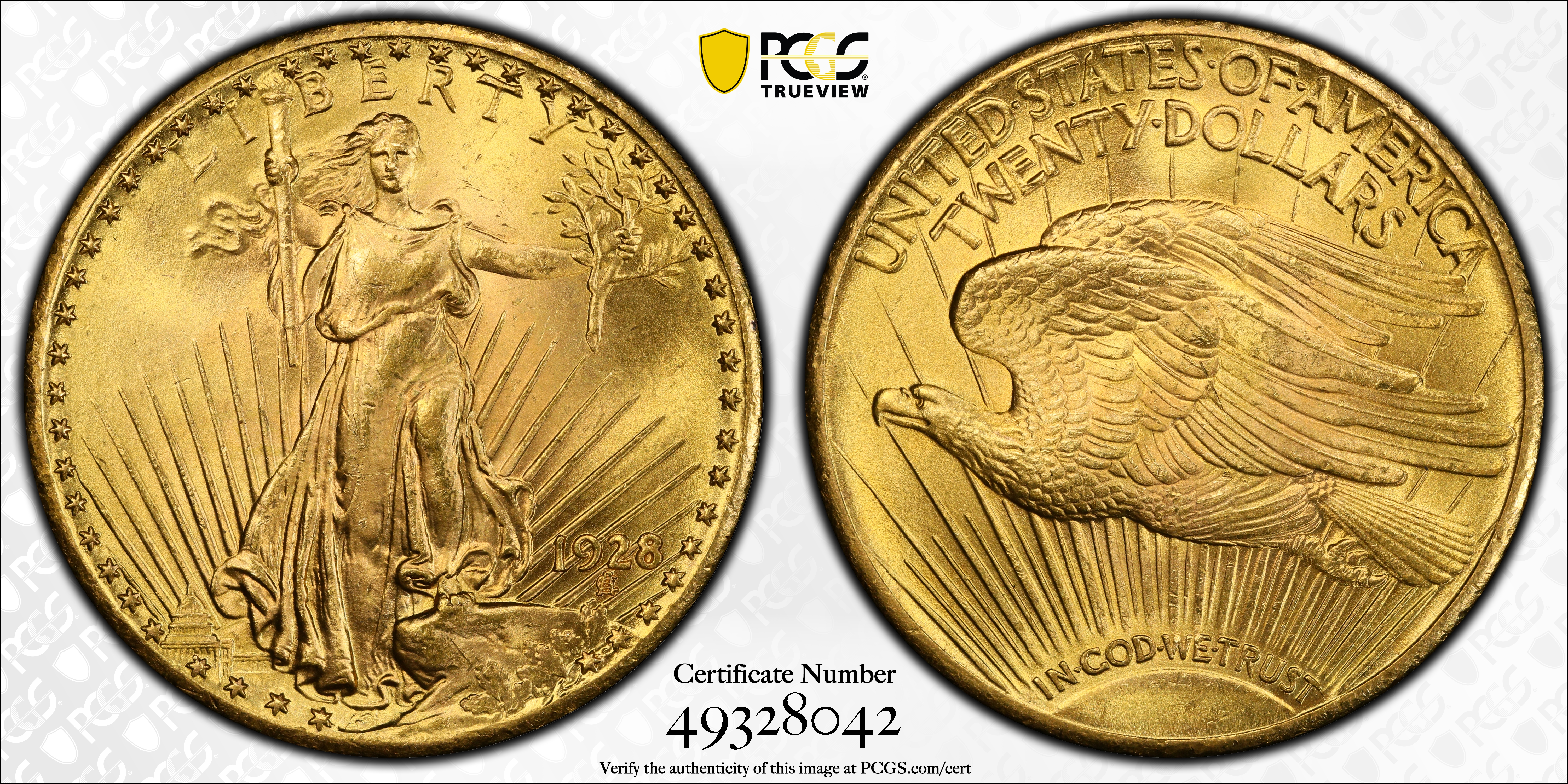 1928 $20 MS65 Certification #49328042, PCGS #9189