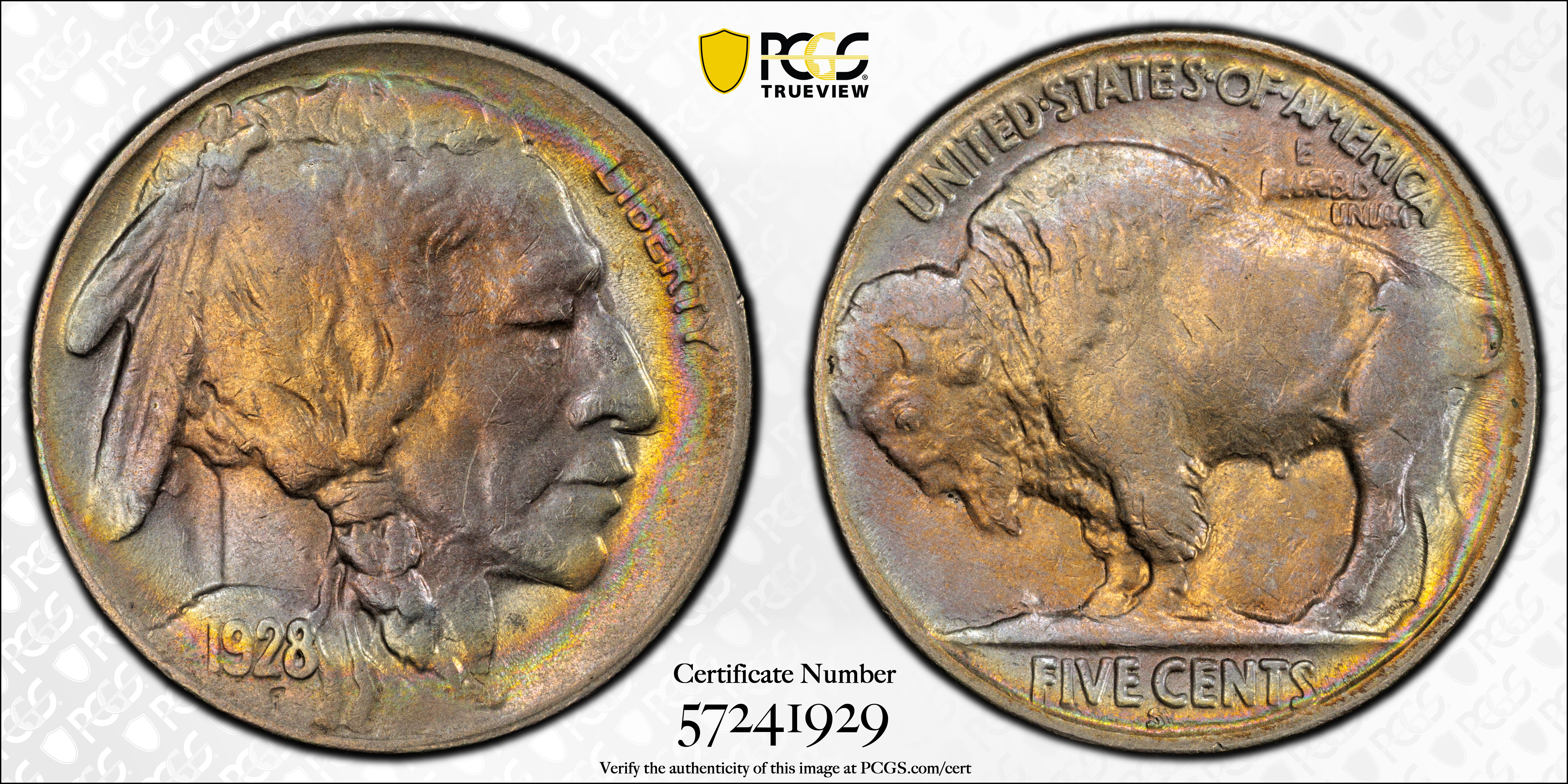 The 1928-S is fairly common in lower circulated grades and somewhat scarce in EF40 and above. It is rare in Gem MS65 condition and extremely rare in Superb Gem MS66. Strike is usually decent for a San Francisco Mint Buffalo. The luster is mostly of the "grey-brilliant" type.
