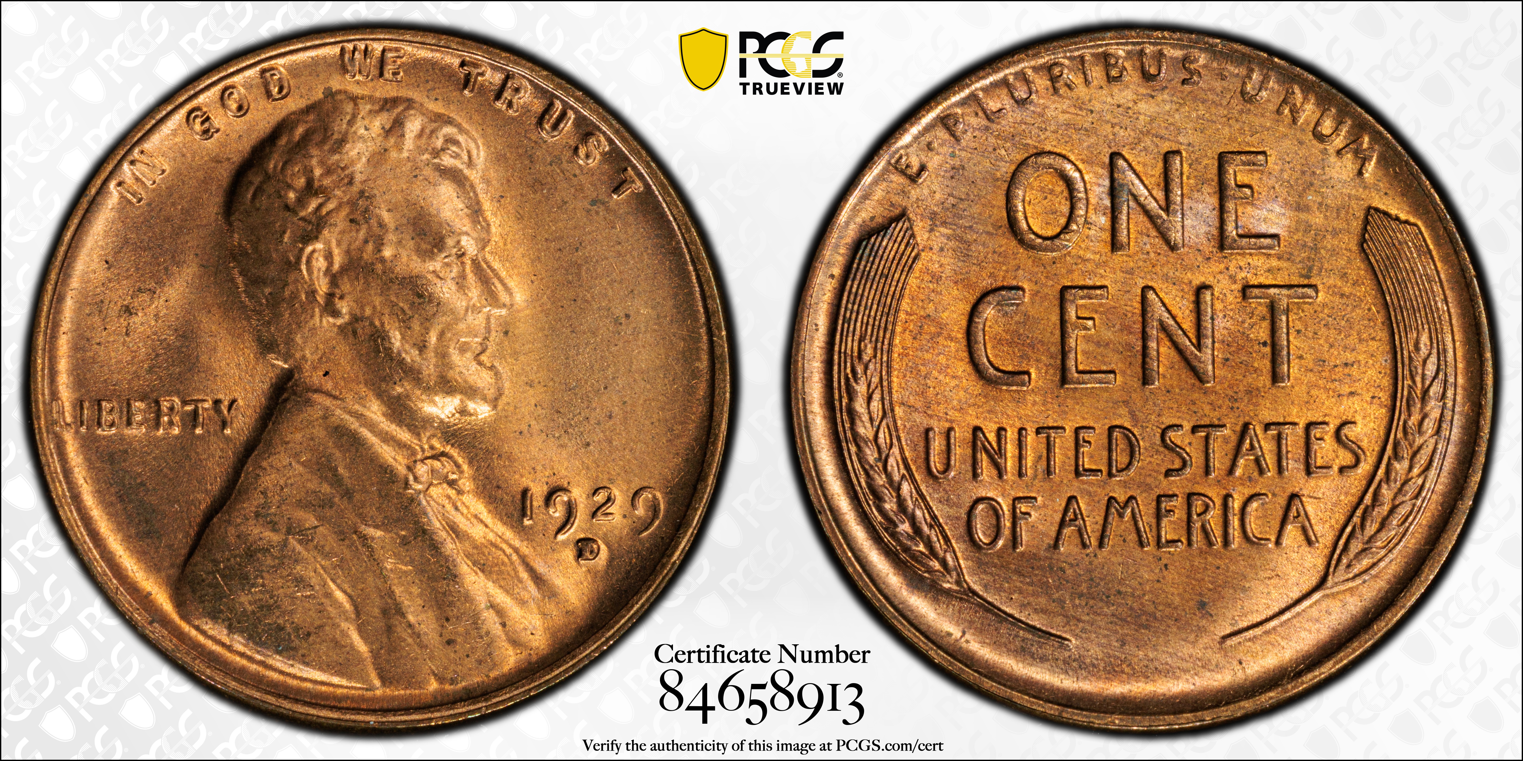 1929-D 1C, RD MS65RD Certification #84658913, PCGS #2599