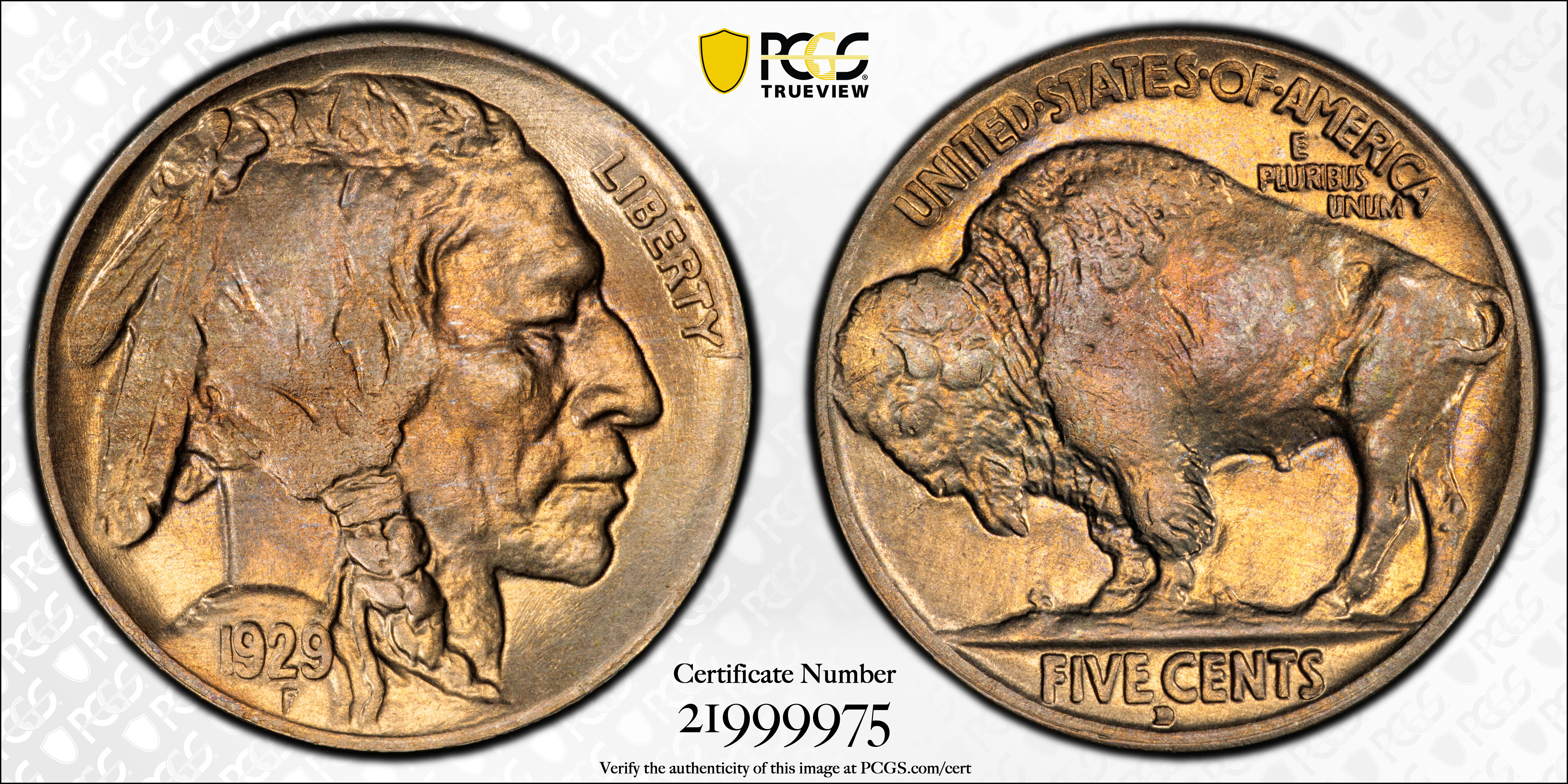 The 1929-D is common in lower circulated grades and semi-common in VF20 thru EF45. It is the rarest 1929 to 1938 Buffalo nickel in mint state and Gem condition, though it is not nearly as rare as the earlier Denver and San Francisco Mint issues. The strike is usually at least decent. Luster is typically somewhat frosty and iridescent.