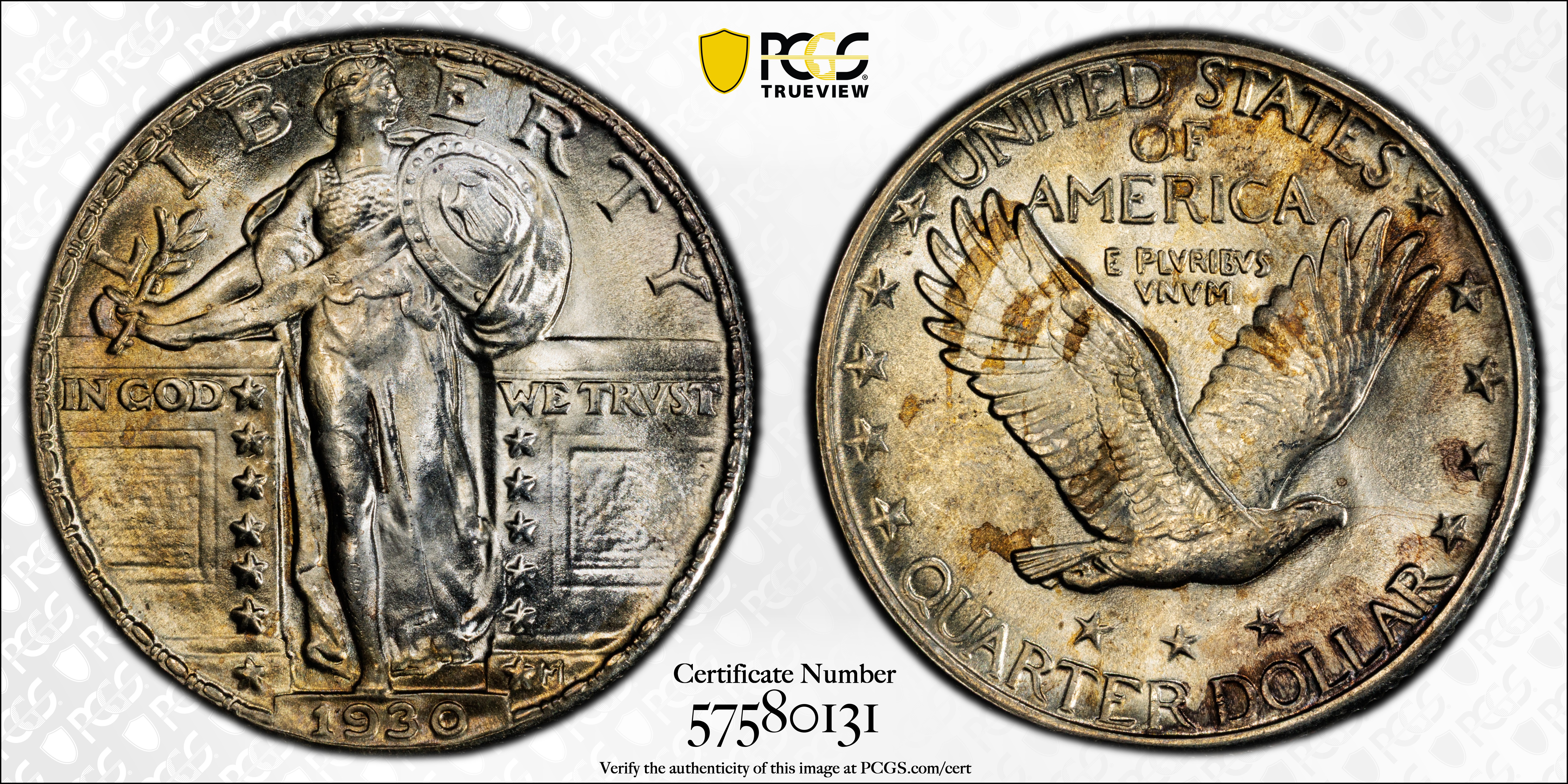 The 1930 Standing Liberty Quarter Dollar is the most common date of the series in Mint State. PCGS alone has certified over 4,000 Uncirculated 1930 Quarters, most often in MS-64 and usually with a Full Head. High grade examples feature a crisp, sharp luster and great eye appeal in a variety of untoned and toned formats.