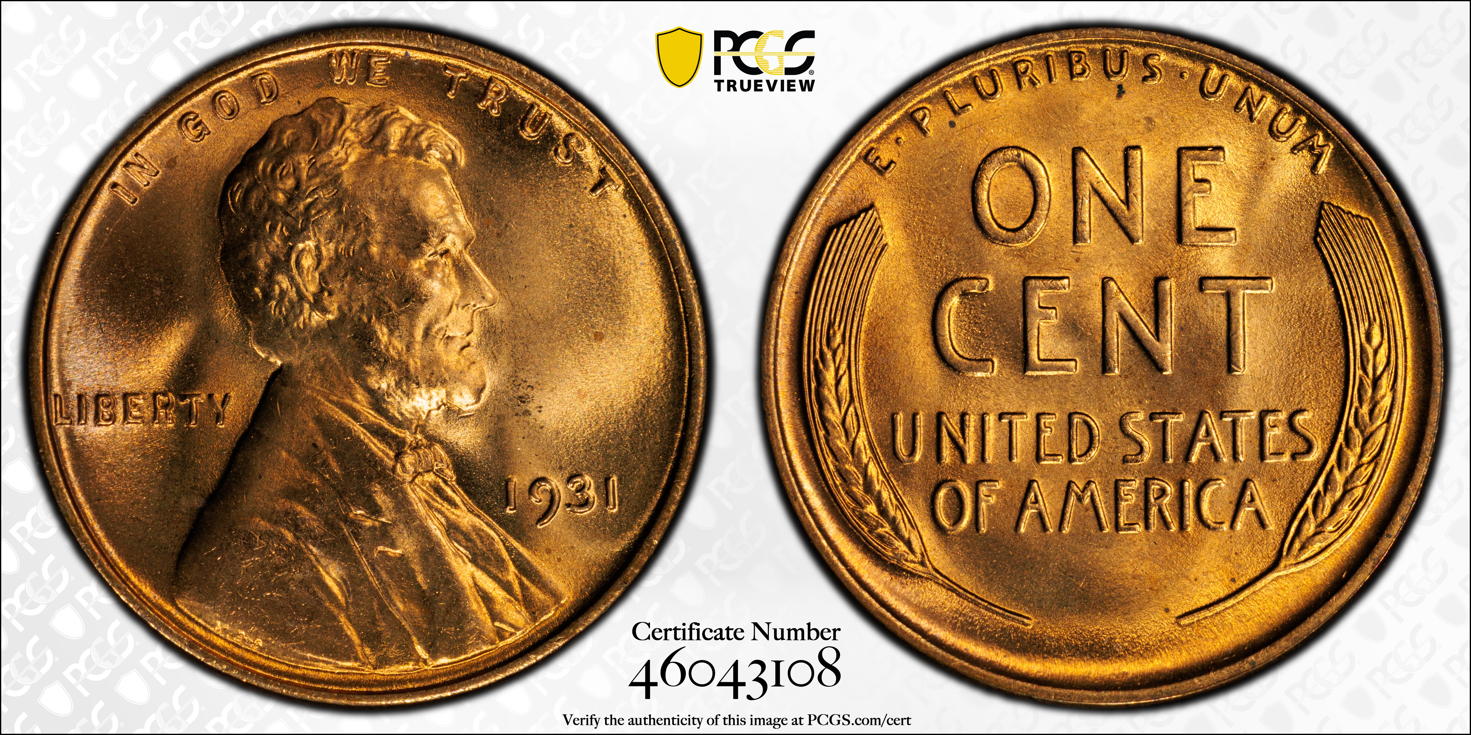 1931 1C, RD MS67RD Certification #46043108, PCGS #2614