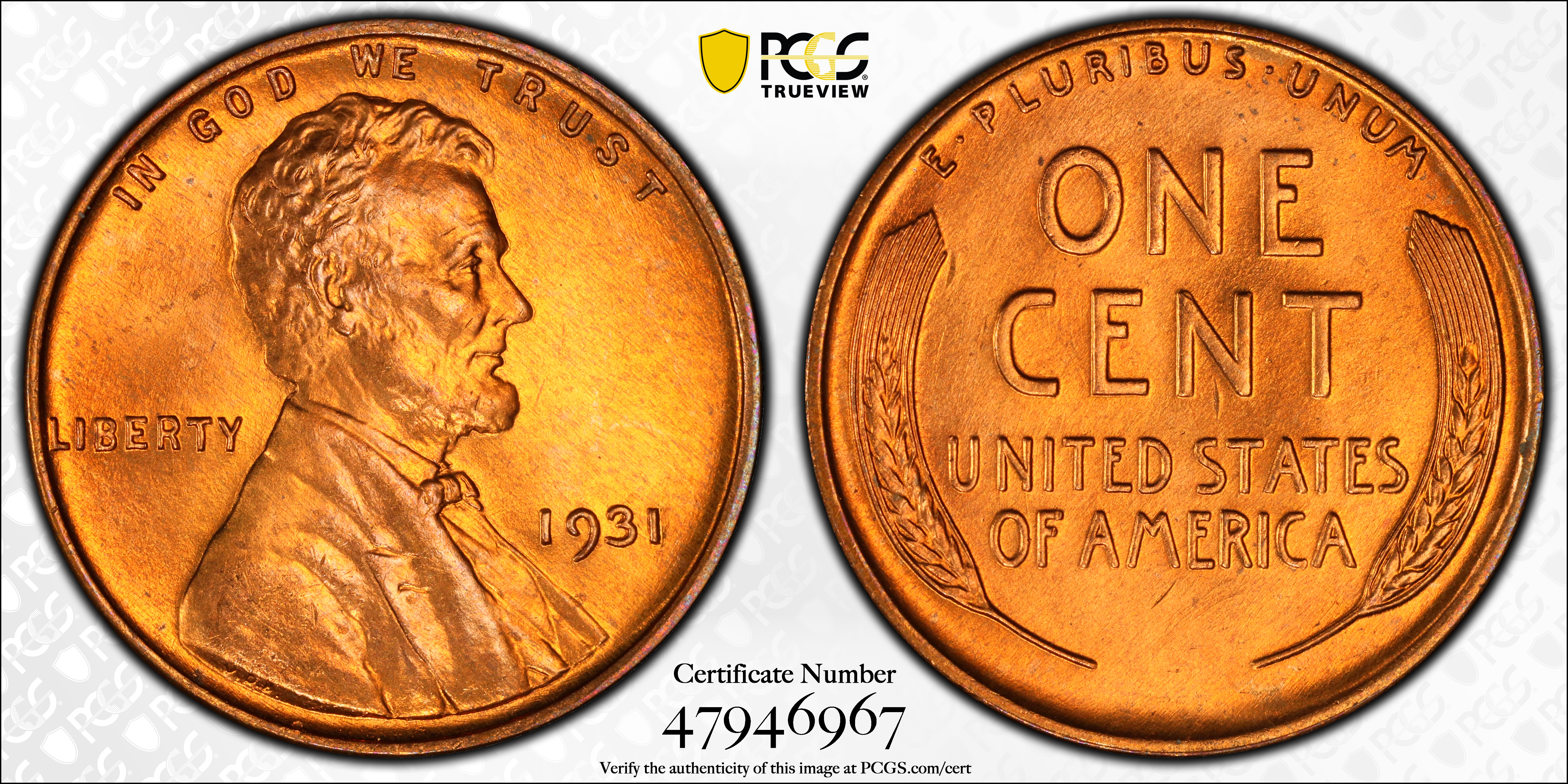 1931 1C, RD MS67RD Certification #47946967, PCGS #2614
