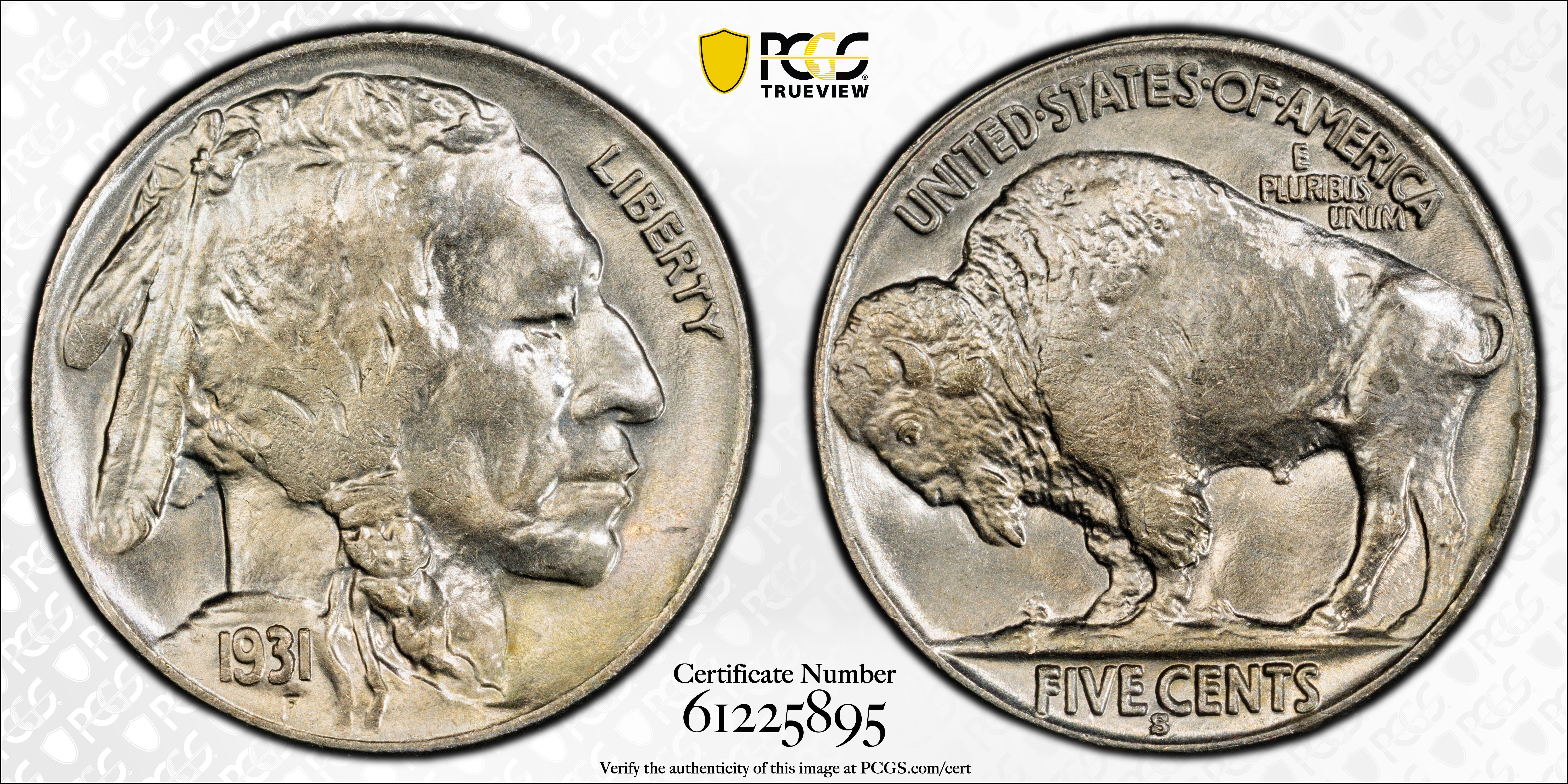 The 1931-S is a very interesting coin. The original mintage of 1,200,000 makes it the second lowest mintage Buffalo nickel, after the 1926-S (970,000 originally minted). But the 1931-S is rare in circulated grades but not that rare in mint state. By 1930, some pioneering dealers, such as PCGS CoinFacts Coin Dealer Hall of Fame member Wayte Raymond, had starting saving original uncirculated rolls of newly minted coins. Mintage was a big factor in the decision making process. The 1931-S Buffalo was such a low mintage that quite a few uncirculated specimens were put away in the year of issue. In fact, there may be more uncirculated examples in existence than circulated ones. (This low mintage saving phenominum was repeated years later with the 1950-D Jeffereson nickel, another issue that's rarer circulated than uncirculated.) The very late dates, i.e. the 1936-1938 issues, are much more plentiful in mint state than the 1931-S, but other than that, the 1931-S is just not that tough to find. The mint state survivors usually have a decent strike and luster can be quite frosty. Interestingly, while fairly common in Gem MS65, the 1931-S is somewhat scarce in MS66, and nearly impossible to find in MS67.