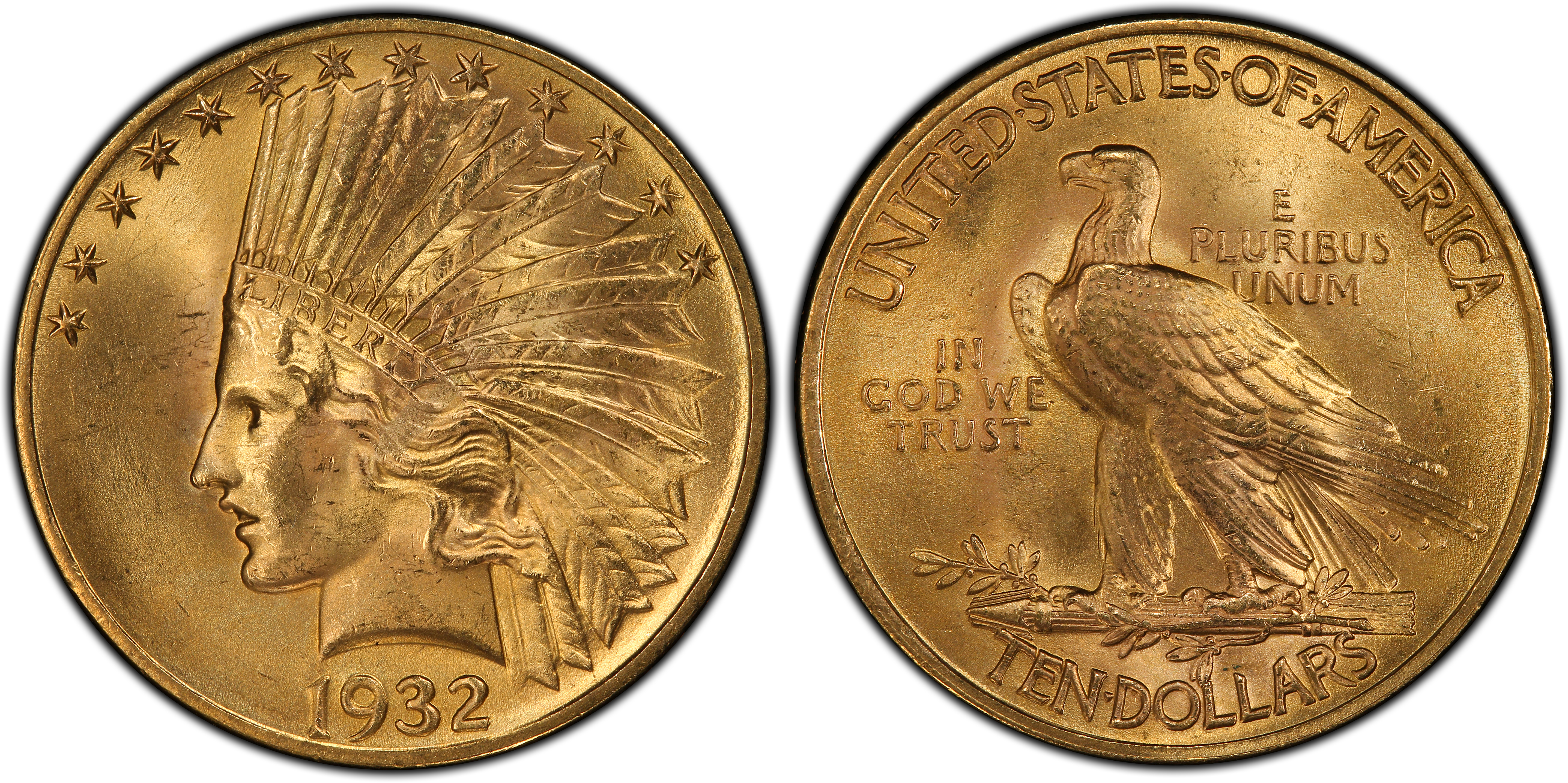 By a substantial margin, the 1932 is the most common Indian Head eagle in Mint State. It is also far and away the commonest issue in gem condition. Above MS-65, the 1932 is very rare and only a relative few really superb examples exist. This issue and the 1926 are generally lumped together as the most common of the series. However, the 1932 is far more common than the 1926 in all grades.The 1932 is typically well struck with very good to excellent lustre. The color is most often a medium to rich greenish gold, and many specimens have light rose or coppery highlights. Many, if not most, examples of this issue have reddish copper spots or stains to some degree. Frosty specimens are the norm but many have a decidedly satiny texture, particularly on the face. Like the 1926, many specimens exhibit unsightly surface "cuts" that seem heavier than typical bagmarks.