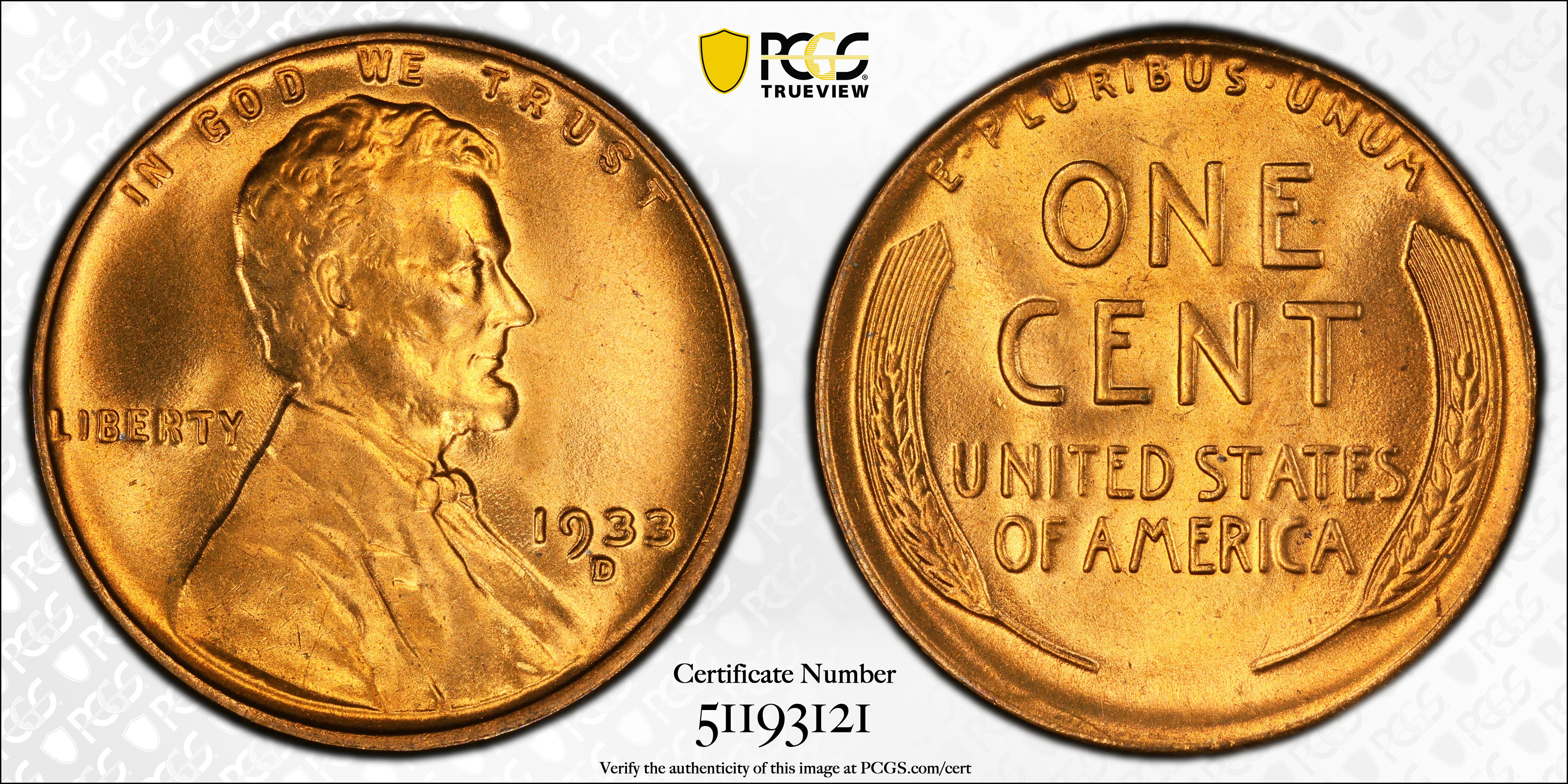 1933-D 1C, RD MS67RD Certification #51193121, PCGS #2632