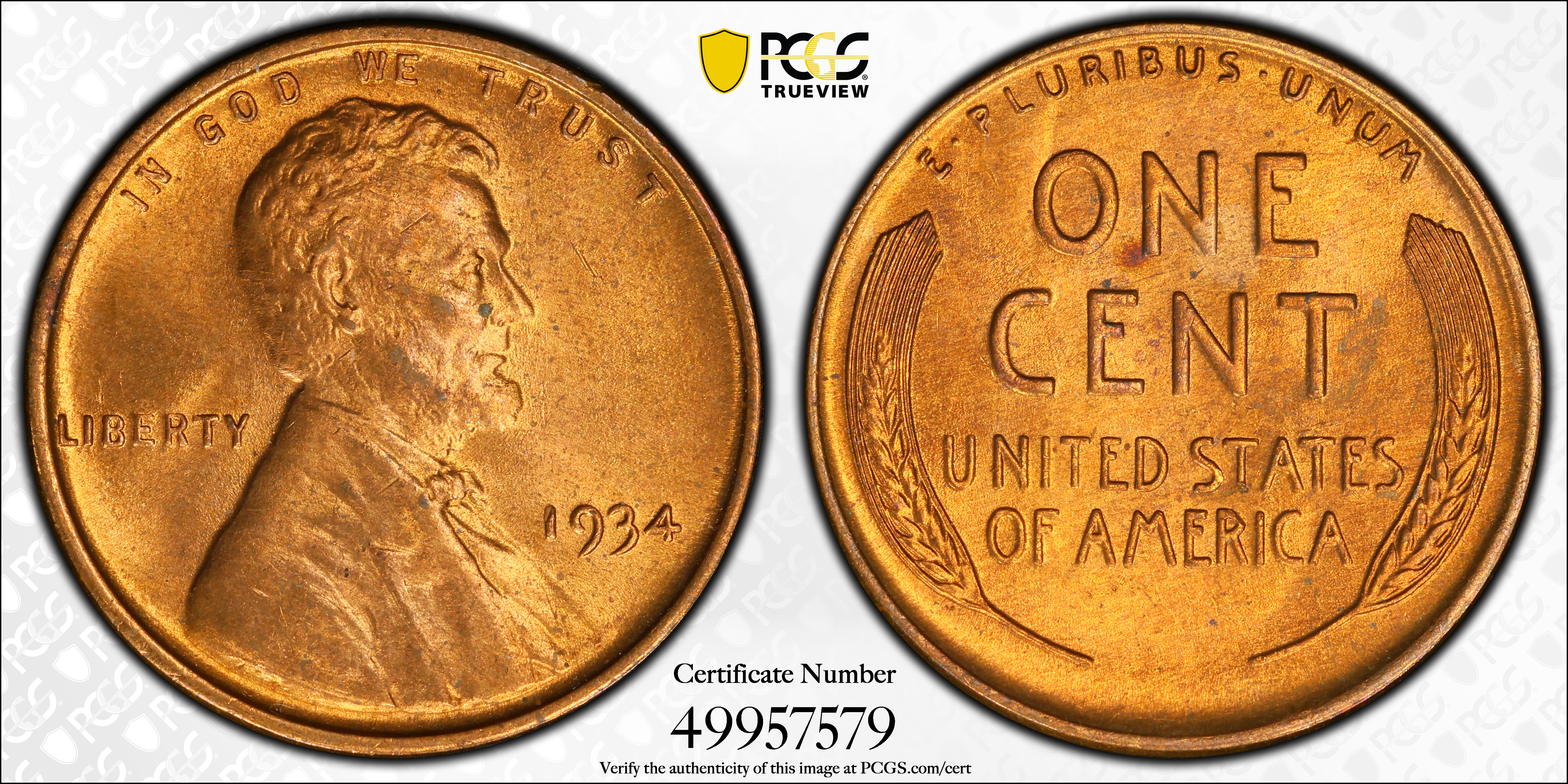 1934 1C, RD MS65RD Certification #49957579, PCGS #2635