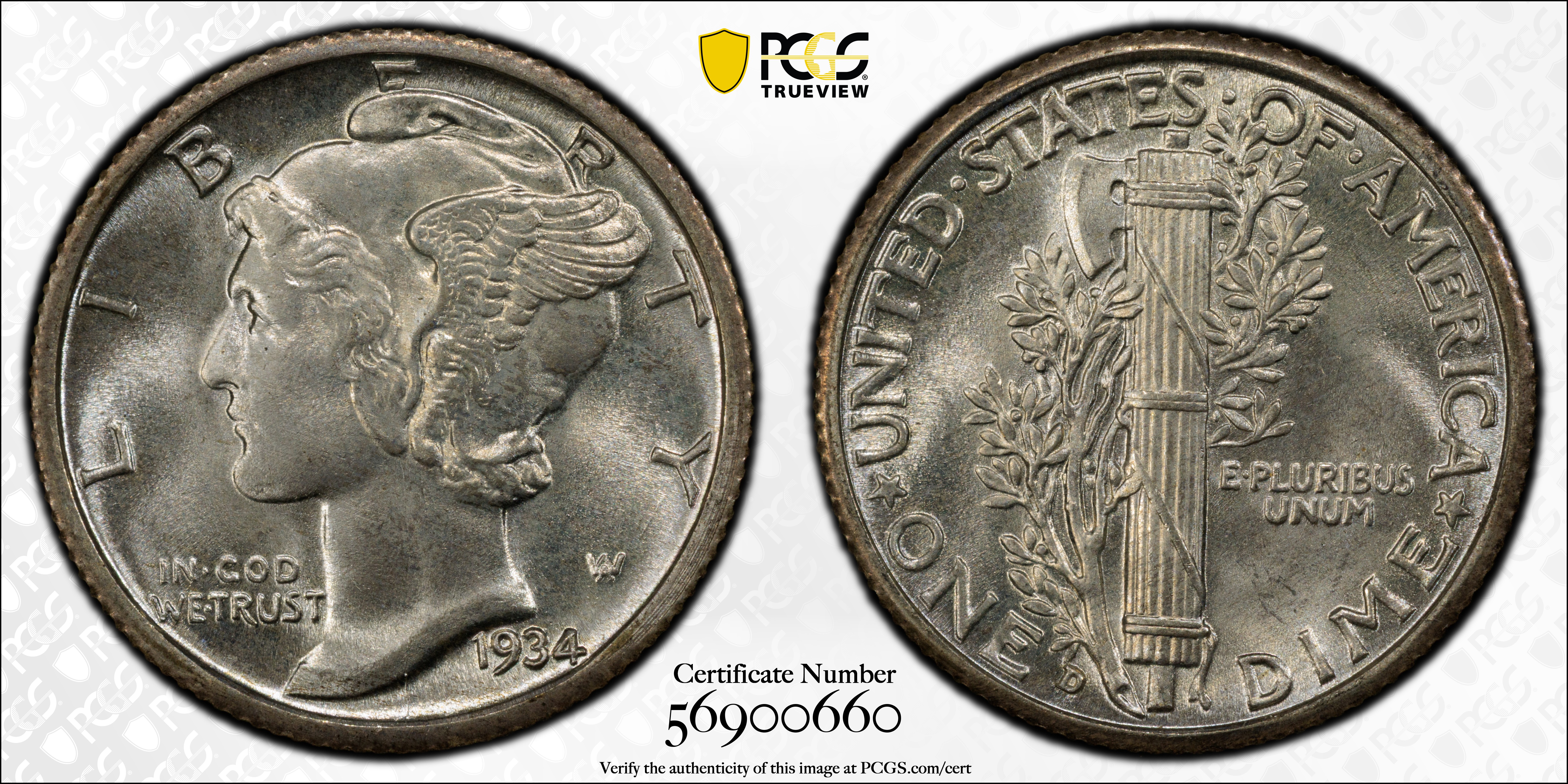 1934-D 10C, FB MS67FB Certification #56900660, PCGS #4991