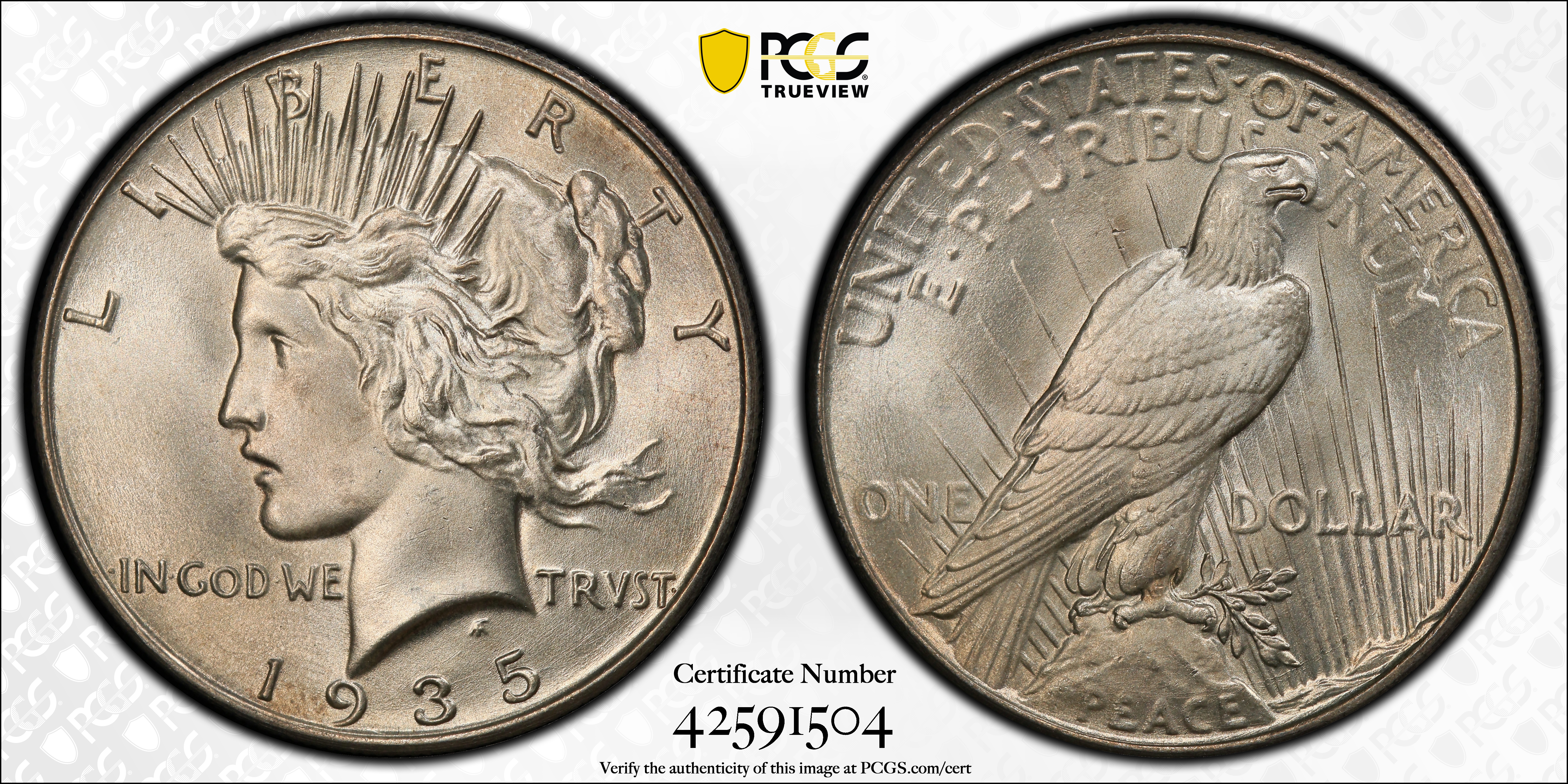 Mint State grades: The 1935 is readily available in Uncirculated grade. Most are in MS-60 through 63 or even 64 grades. MS-65 pieces are scarcer but can be found with ease. Lustre is often satiny, rather than deeply frosty. The strike is usually decent, including on the center of the reverse. Cherrypickers would go out of business if all Peace dollar issues were like the 1935!