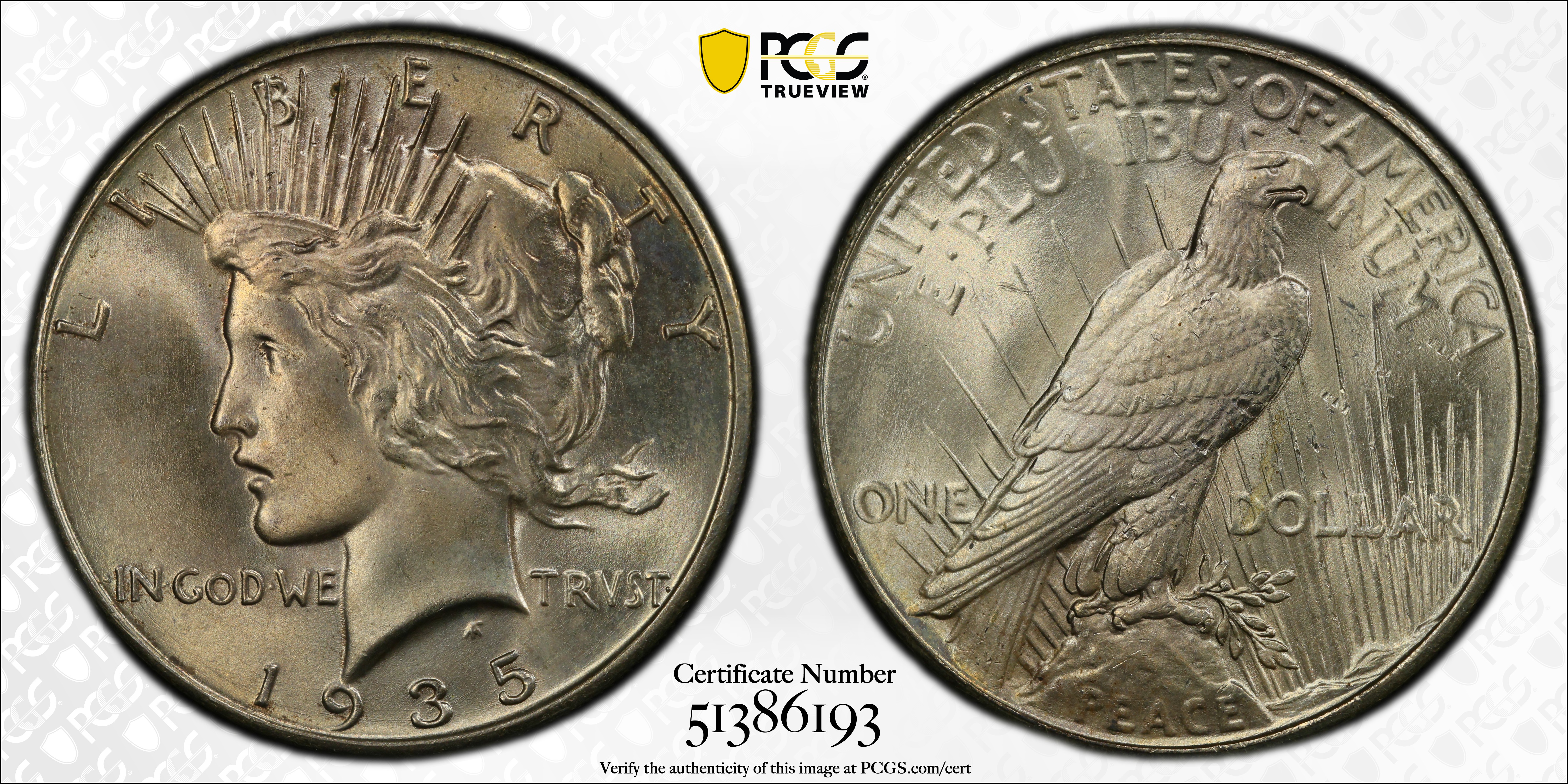 Mint State grades: The 1935 is readily available in Uncirculated grade. Most are in MS-60 through 63 or even 64 grades. MS-65 pieces are scarcer but can be found with ease. Lustre is often satiny, rather than deeply frosty. The strike is usually decent, including on the center of the reverse. Cherrypickers would go out of business if all Peace dollar issues were like the 1935!