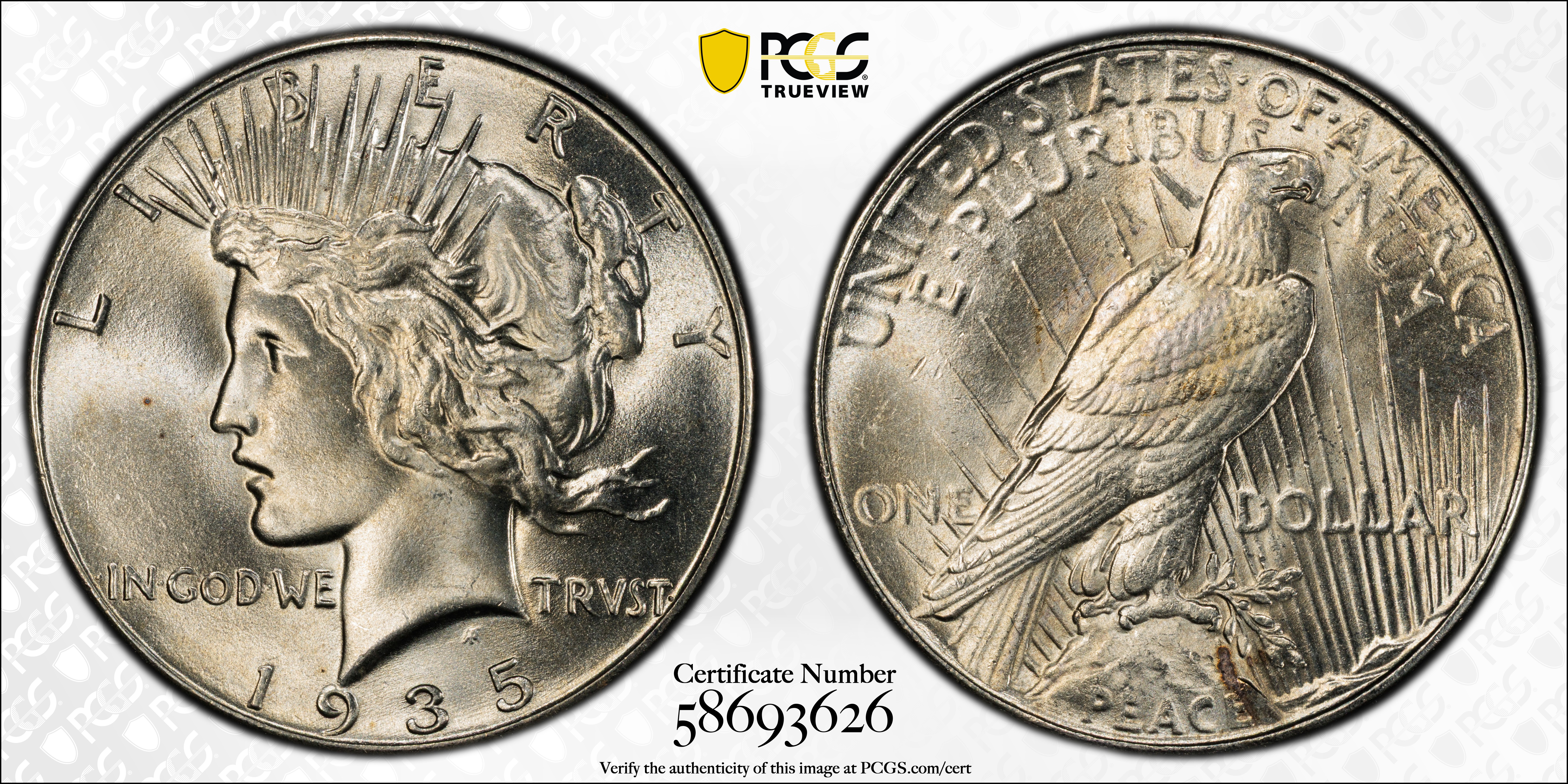 Mint State grades: The 1935 is readily available in Uncirculated grade. Most are in MS-60 through 63 or even 64 grades. MS-65 pieces are scarcer but can be found with ease. Lustre is often satiny, rather than deeply frosty. The strike is usually decent, including on the center of the reverse. Cherrypickers would go out of business if all Peace dollar issues were like the 1935!