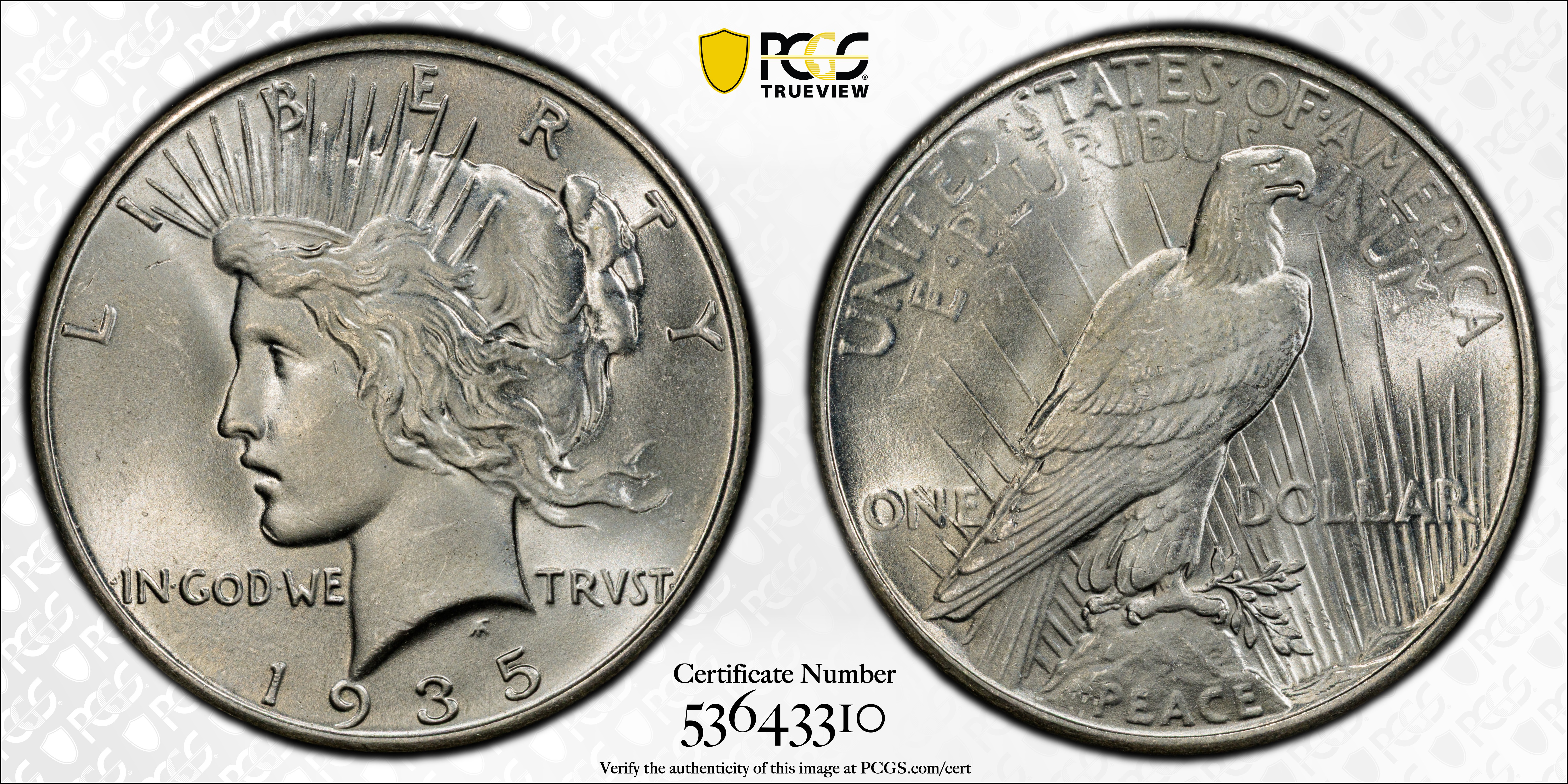 Mint State grades: The 1935 is readily available in Uncirculated grade. Most are in MS-60 through 63 or even 64 grades. MS-65 pieces are scarcer but can be found with ease. Lustre is often satiny, rather than deeply frosty. The strike is usually decent, including on the center of the reverse. Cherrypickers would go out of business if all Peace dollar issues were like the 1935!