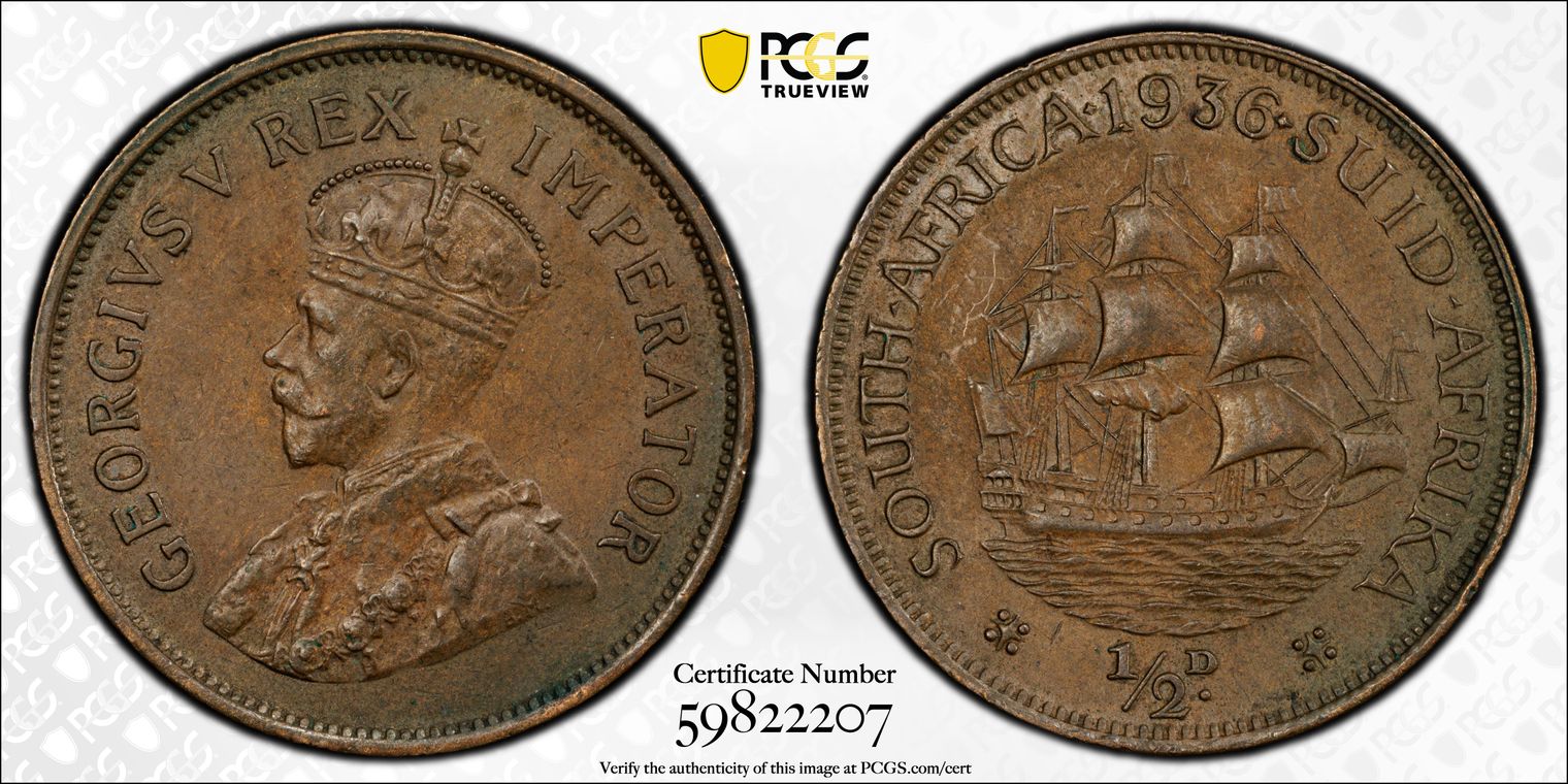 1936 1/2D, BN MS62BN Certification #59822207, PCGS #394838
