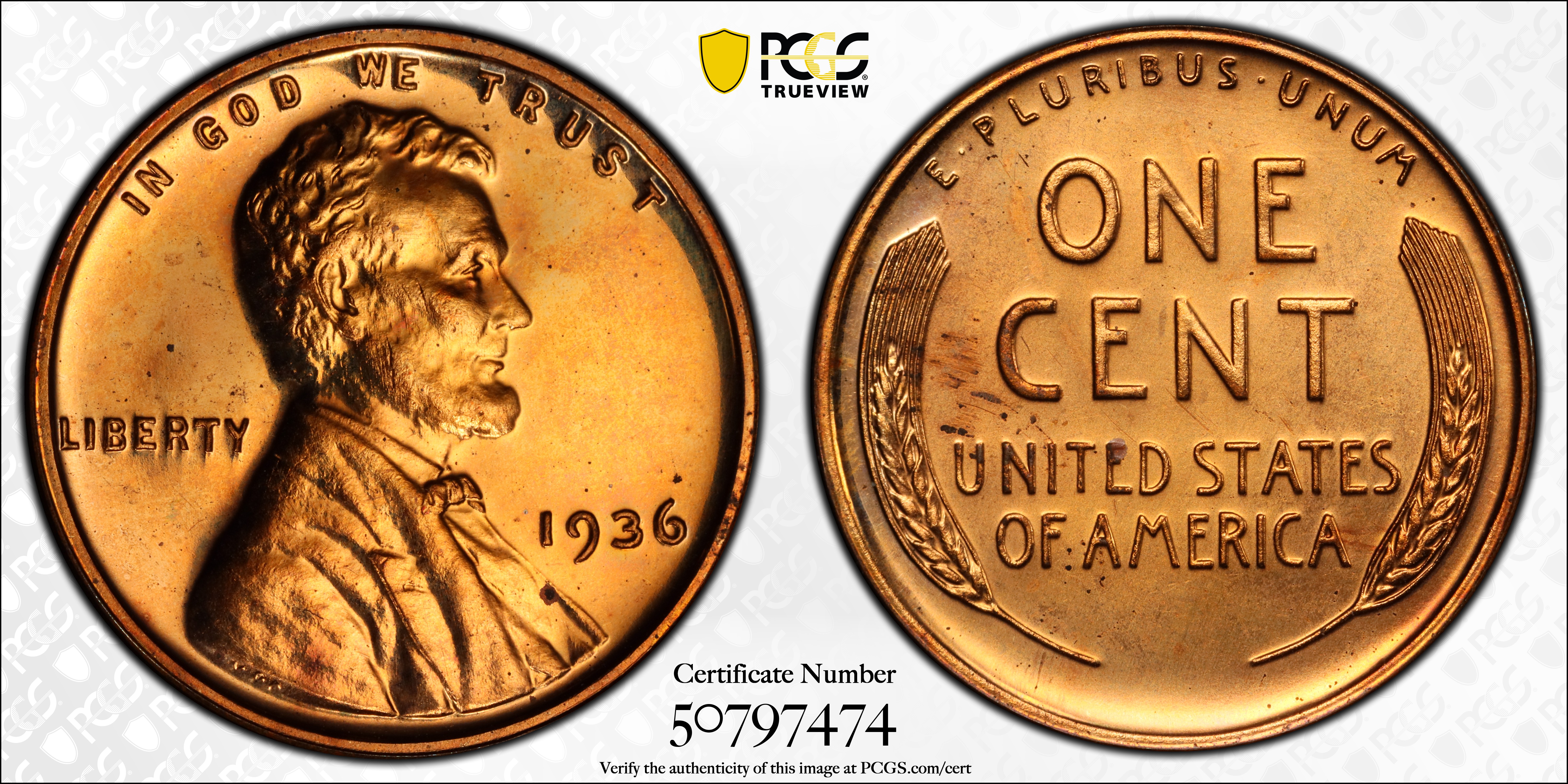1936 1C Brilliant, RD PR65RD Certification #50797474, PCGS #3335