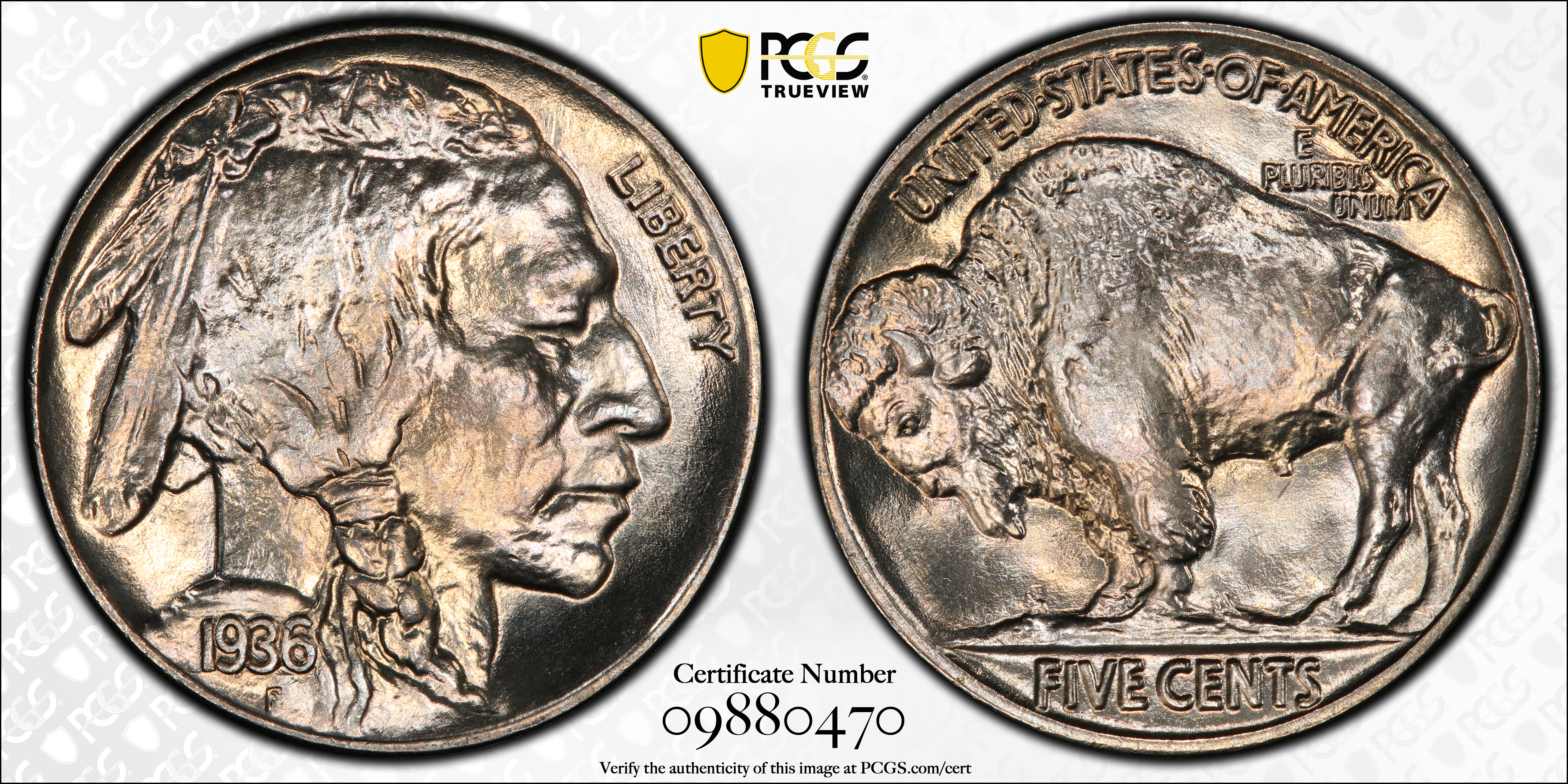 The 1936 is one of the most common Buffalo nickels in all grades. In mint state and Gem condition it is not as common as the 1937, 1937-D, 1937-S and 1938-D, but it is common nonetheless. It is slightly more available than the 1936-D and 1936-S. Strike is usually strong and luster is usually good.