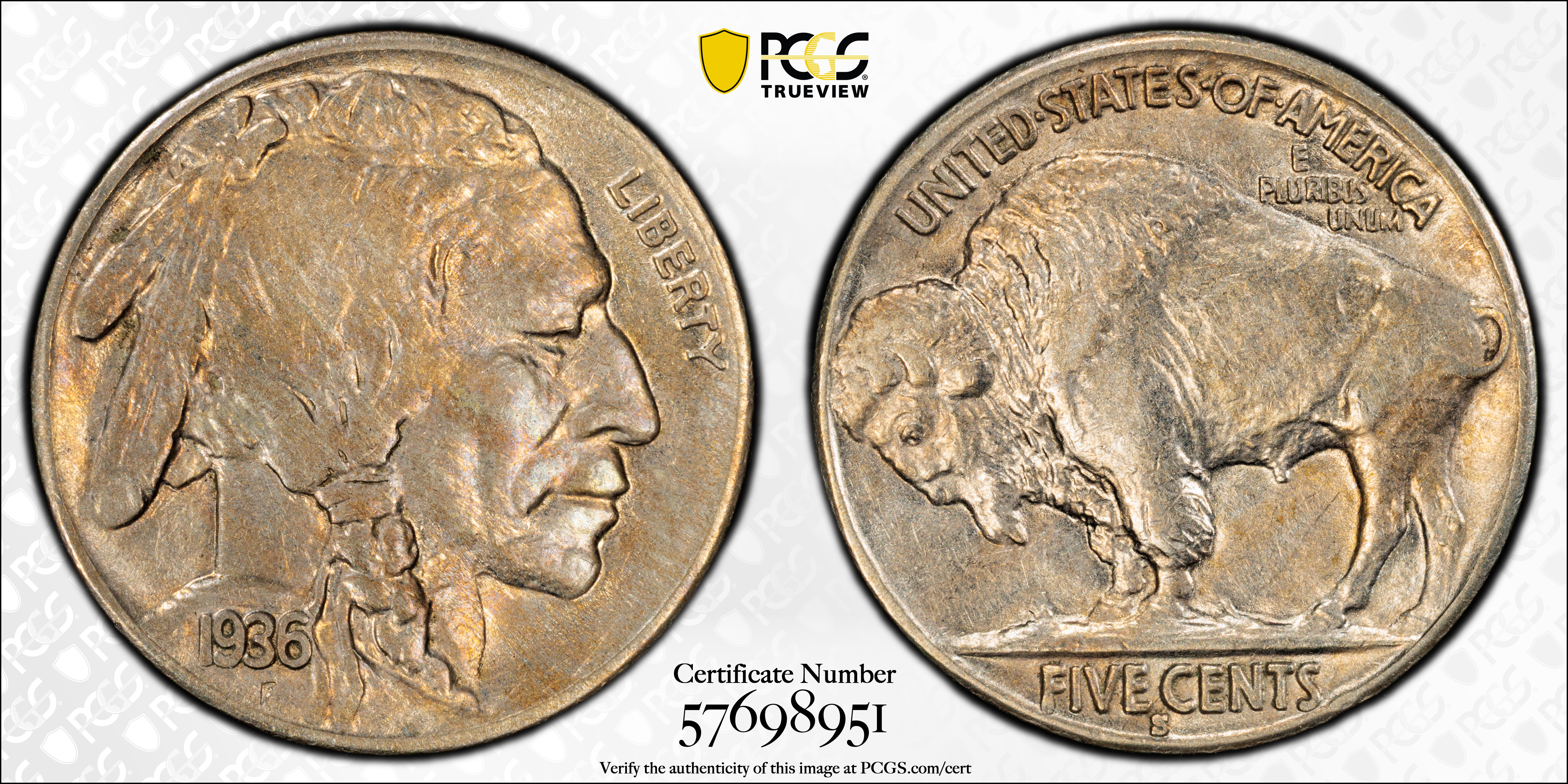 The 1936-S is common in all grades though in mint state and Gem condition it is the scarcest of the 1936 to 1938 non-variety issues. The strike is usually sharp for a San Francisco Mint Buffalo nickel and luster is typically of the grey brilliant type.