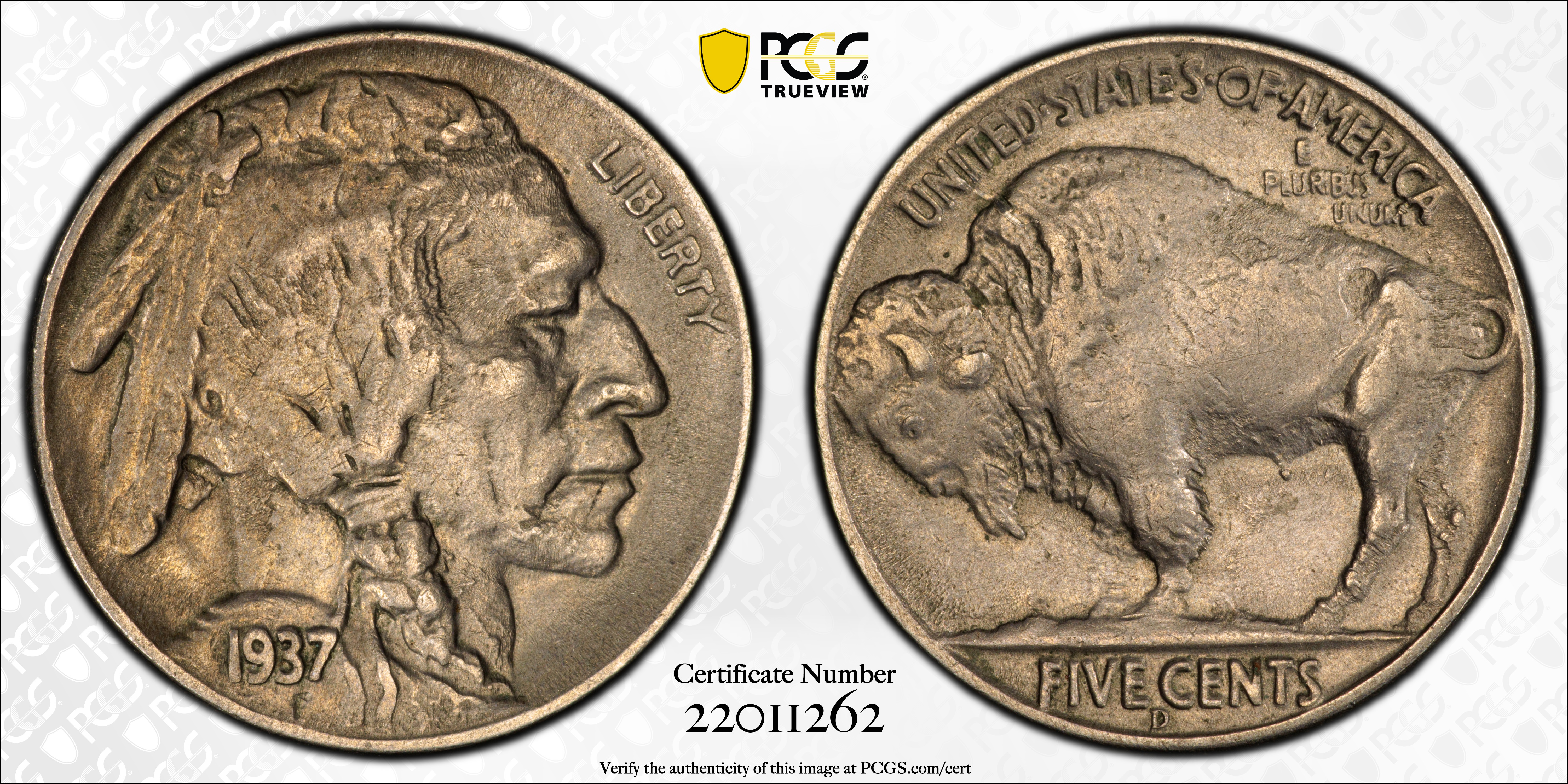 1937-D 5C 3 Legs AU55 Certification #22011262, PCGS #3982