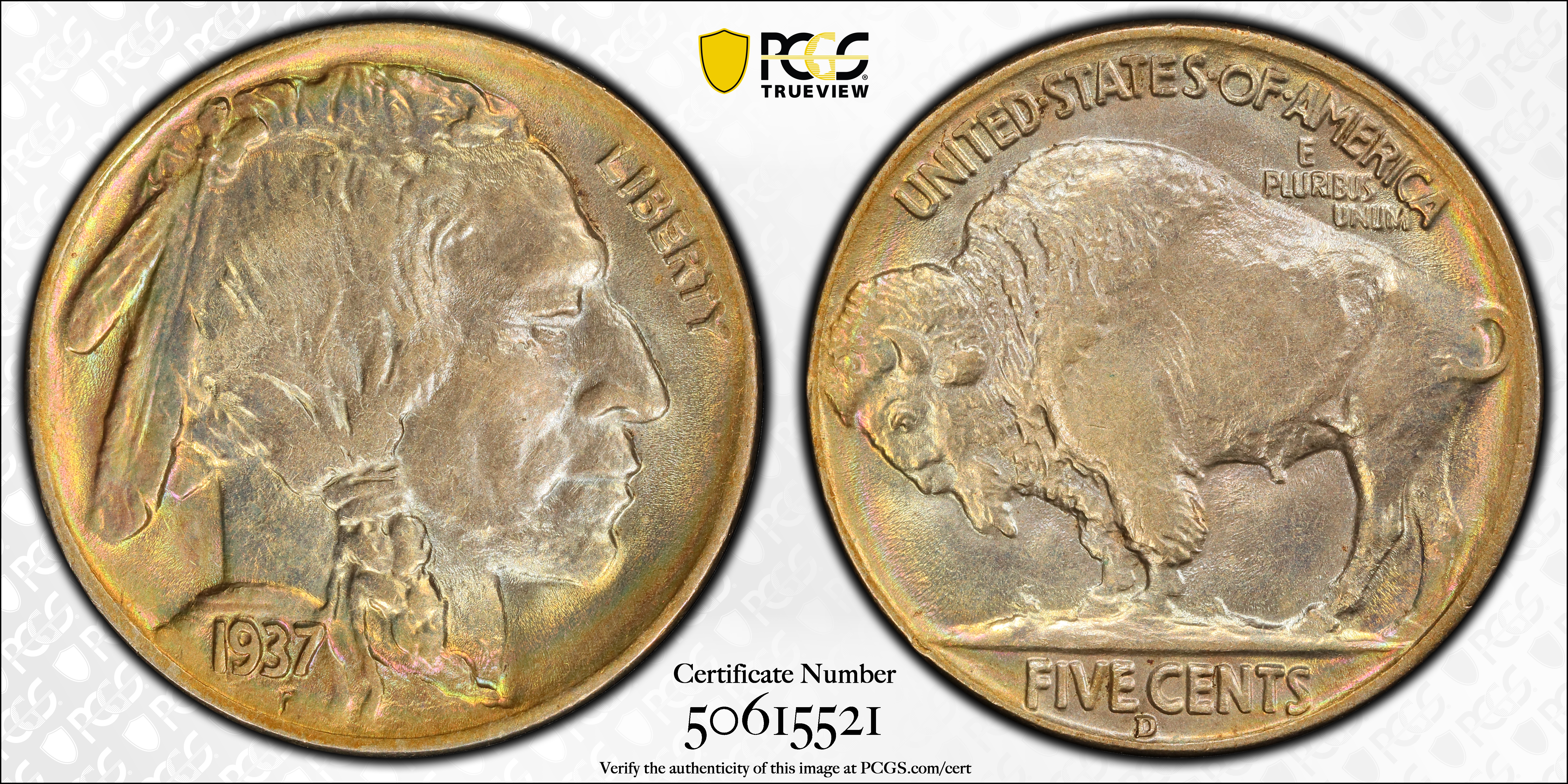 The 1937-D is a common Buffalo nickel in all grades. Only the 1937 and 1938-D are easier to find in mint state and Gem condition. Strike is usually very sharp and luster is typically quite frosty.