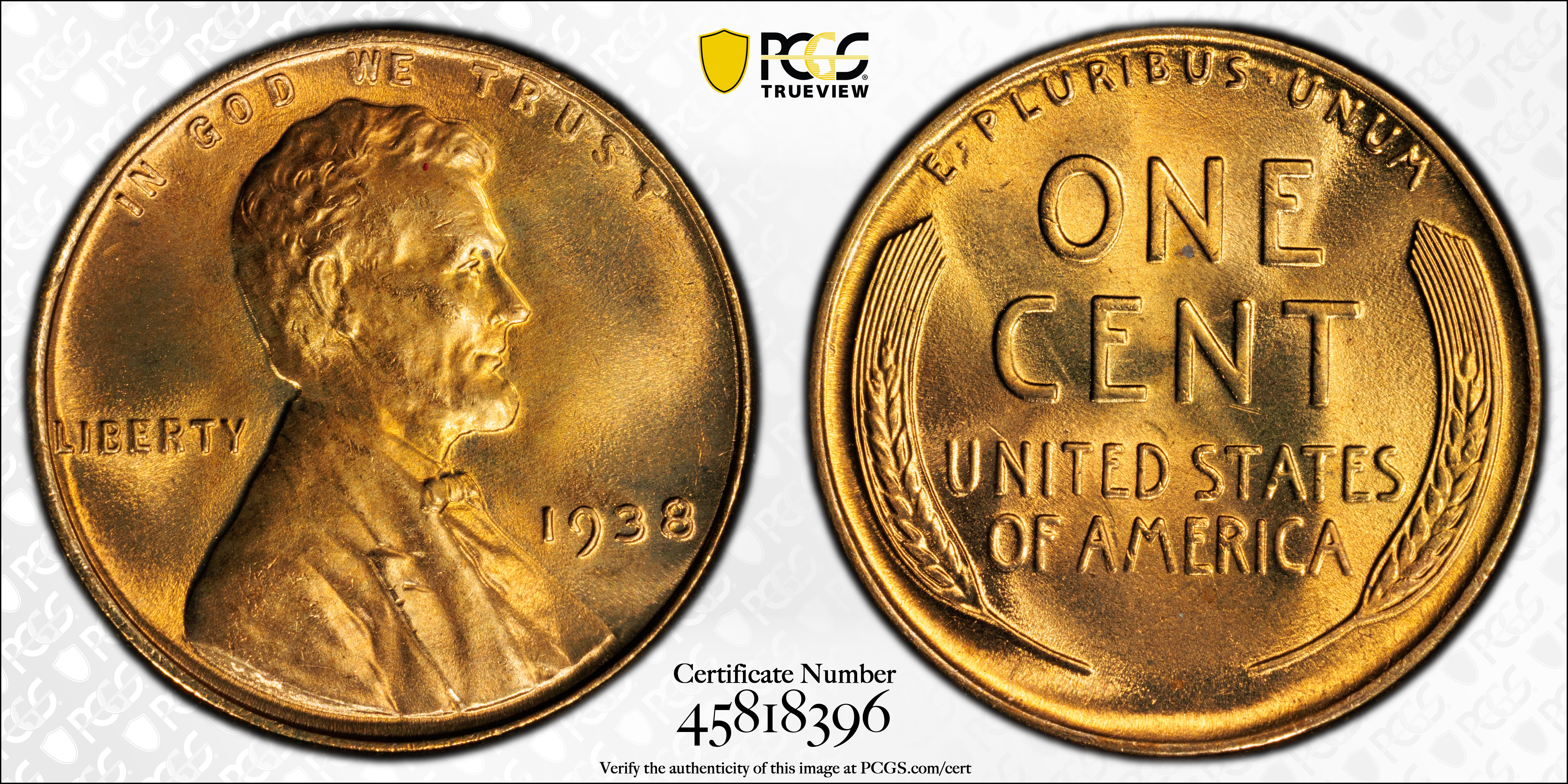 1938 1C, RD MS67RD Certification #45818396, PCGS #2668