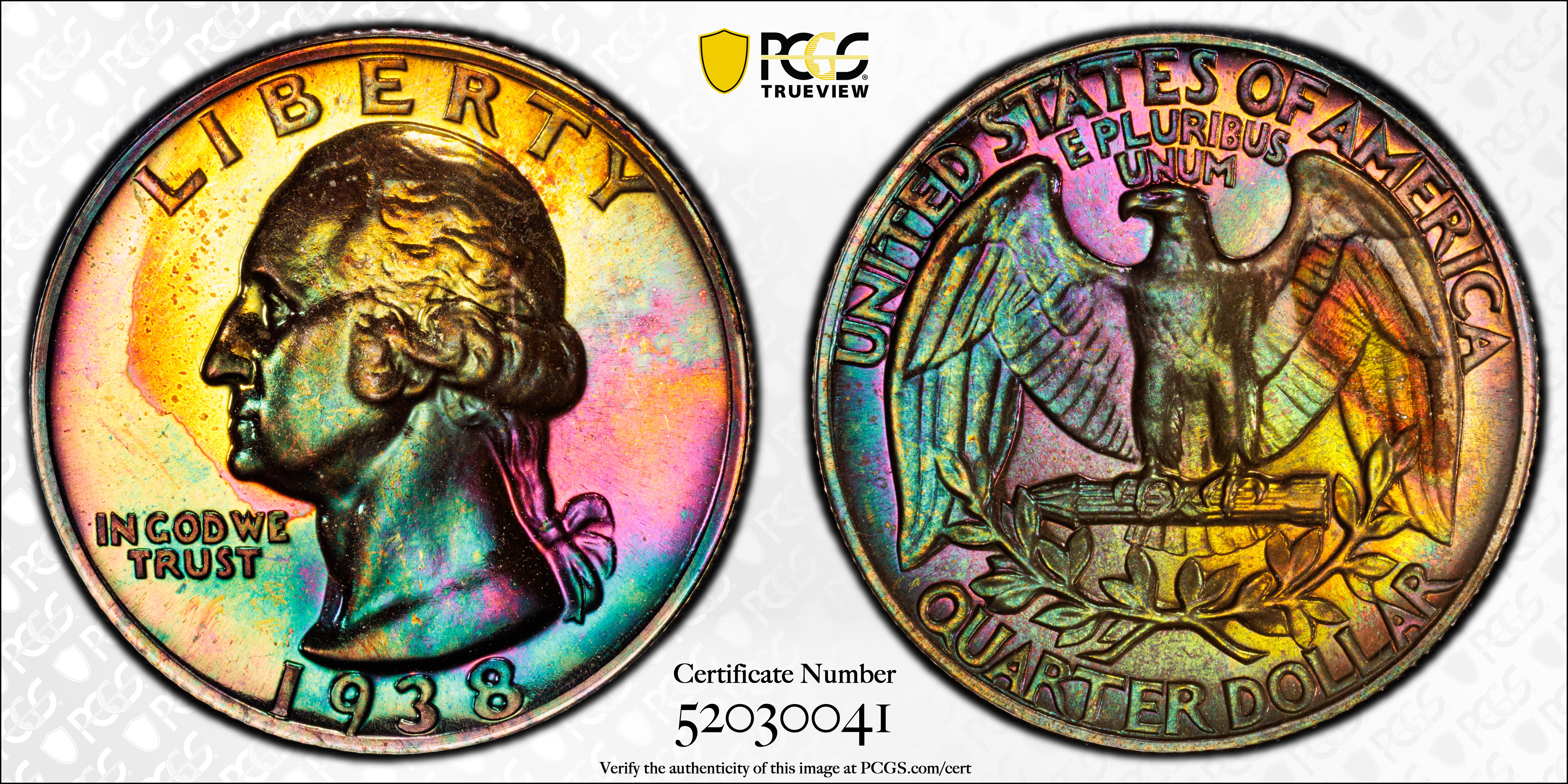 The 1938 Proof Washington Quarters has the third lowest mintage in the entire Proof Washington Quarter series. Most surviving examples appear to be in about PR65 condition. Examples in PR66 are scarce but still probably over 1,000 still survive in this condition and higher. In PR67 it becomes somewhat scarce with possibly less than a couple hundred examples available. In PR68 condition it is a diamond in the rough, as there is less than a handful of examples known and none existing in any higher condition.