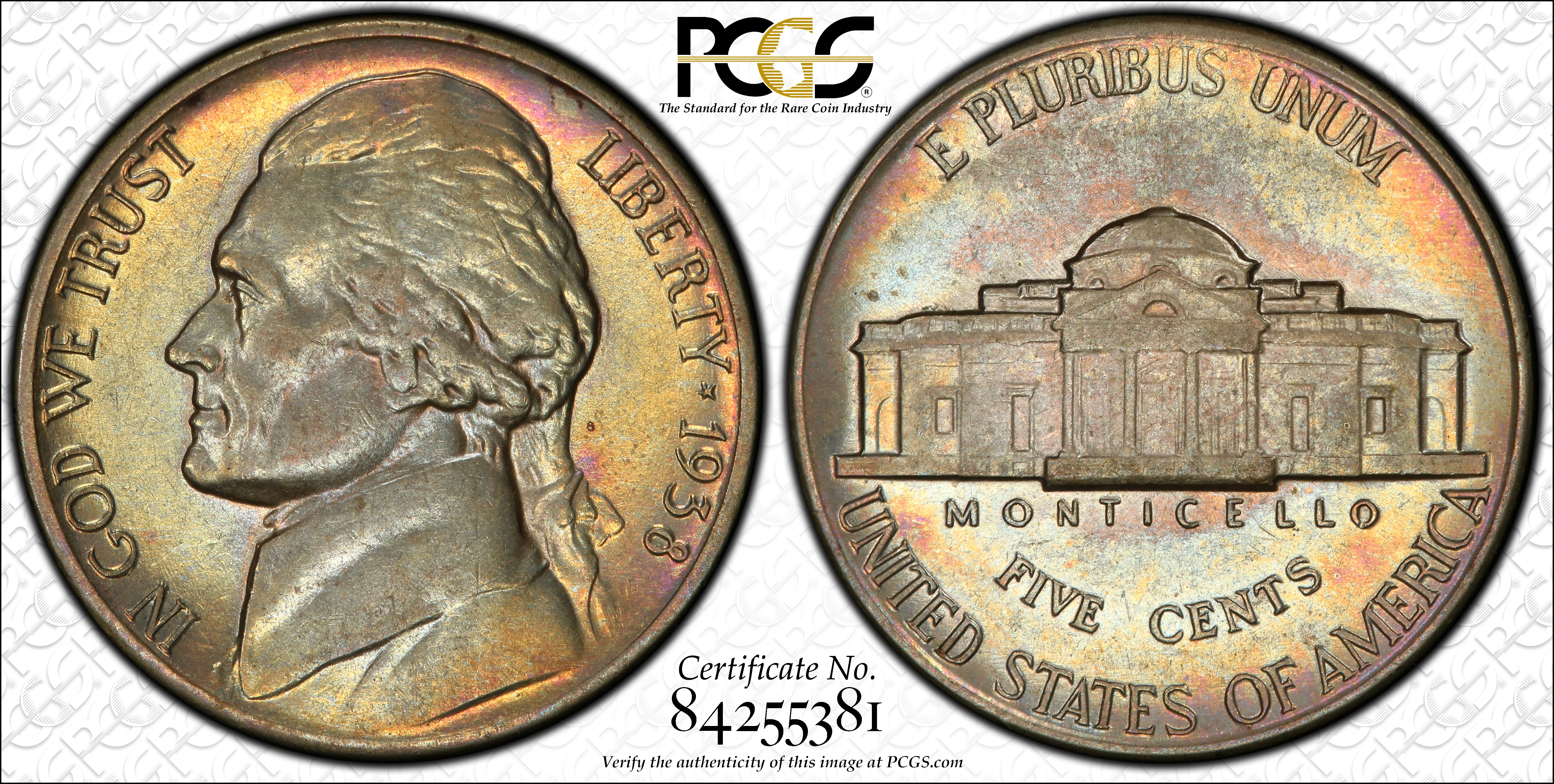 Reverse: Schlag’s original reverse concept—an innovative three-quarters perspective of Jefferson’s mansion, Monticello—was rejected by the Treasury Department. Per competition rules, Schlag was required to revise the design for no additional compensation. Here, the revised Monticello is depicted as a flat, head-on portrayal of the neoclassical mansion Jefferson designed himself near Charlottesville, Virginia. While the rendering loses much dimensionality, the octagonal dome and portico details remain visible on better strikes. The inscription E PLURIBUS UNUM sits atop the reverse. The word MONTICELLO—a revision forced upon Schlag that required adjusting all other text—sits directly under the building. The denomination FIVE CENTS curves beneath it, with UNITED STATES OF AMERICA running counterclockwise along the bottom rim.