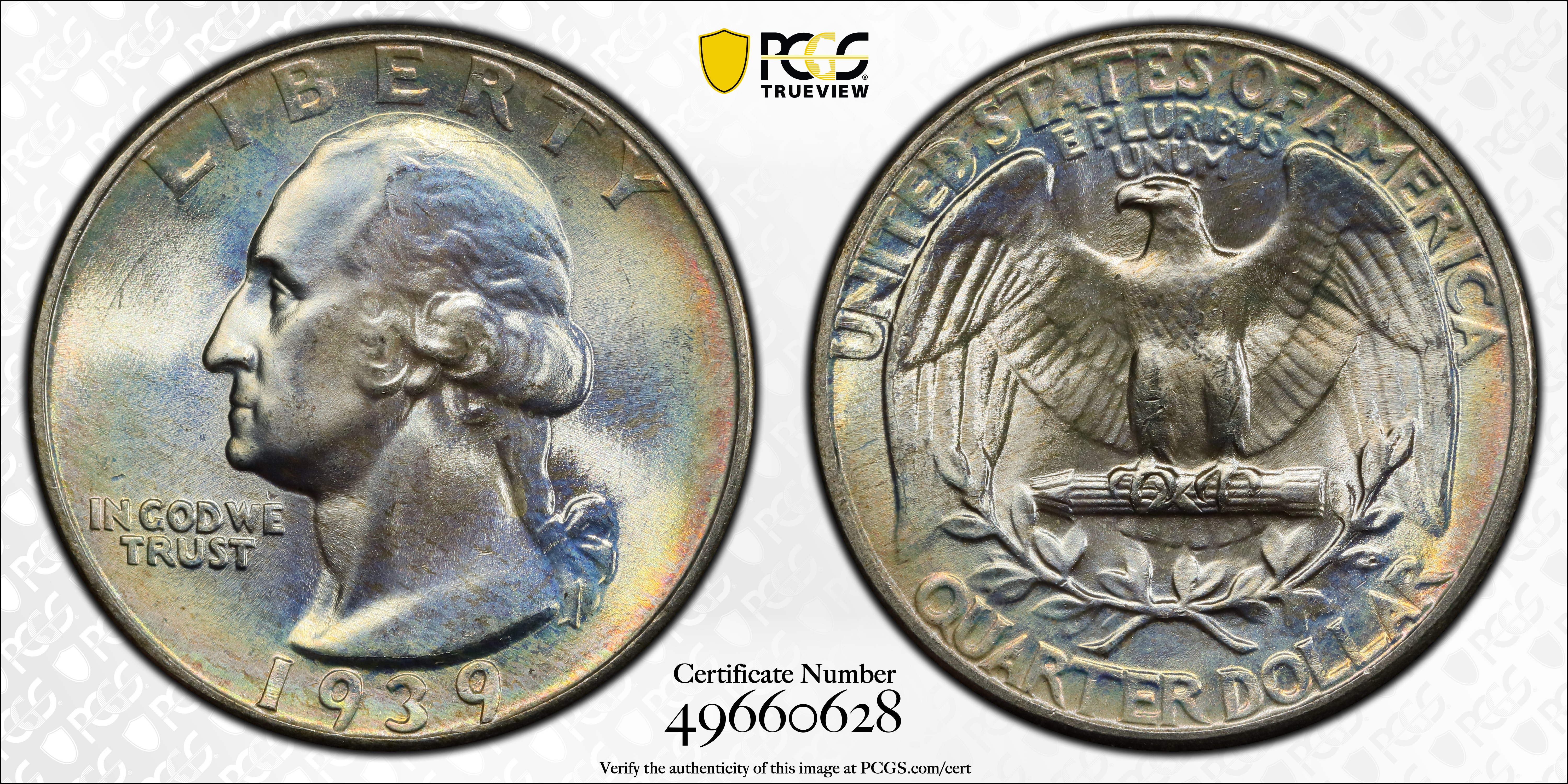 In MS66 and MS67 condition the 1939 is the most available Washington quarter of the 1930s. There are many near perfect Gems. Many examples have truly superb little golden iridescent color. This issue really comes nice!