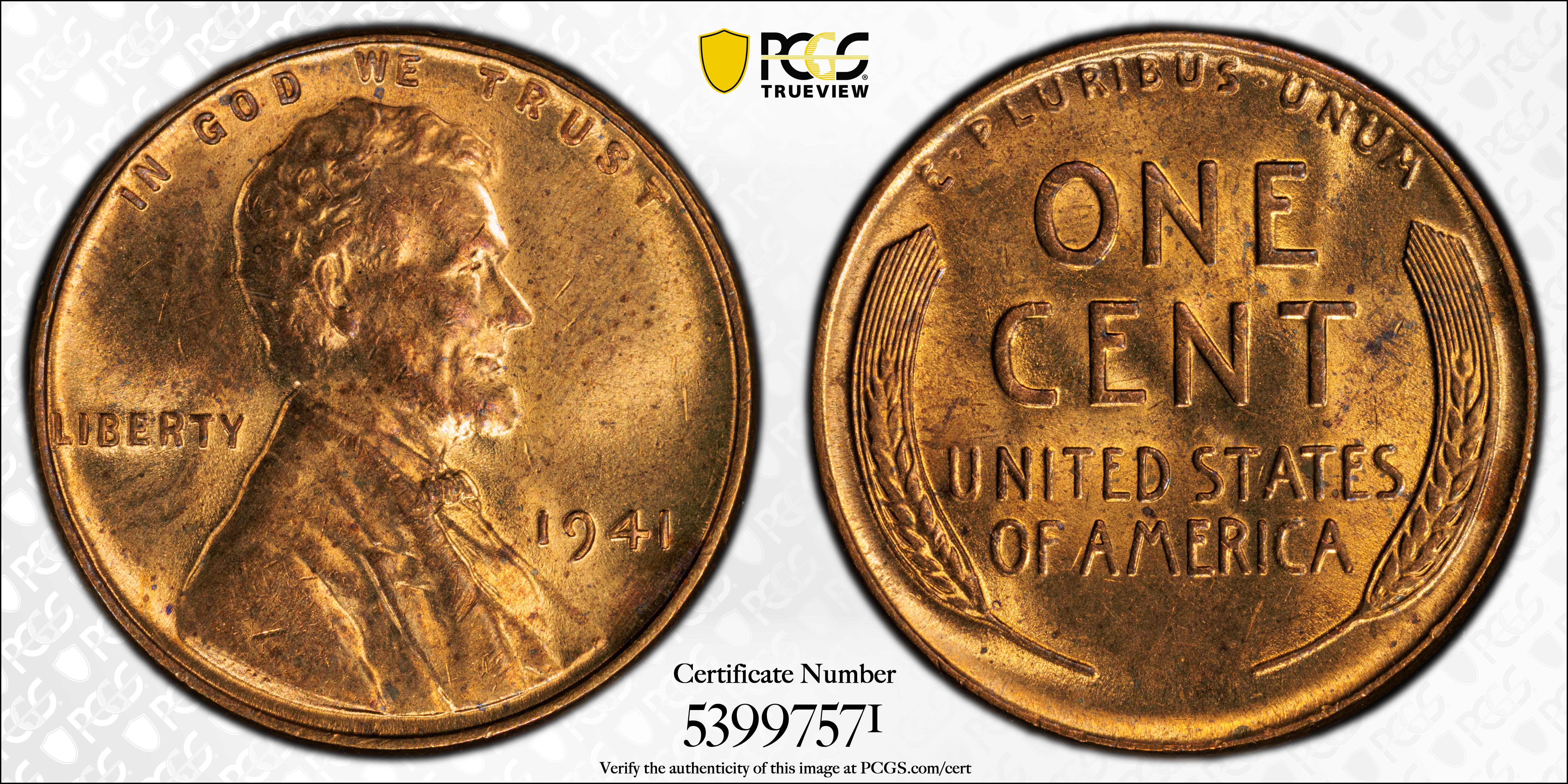 1941 1C, RD MS63RD Certification #53997571, PCGS #2695