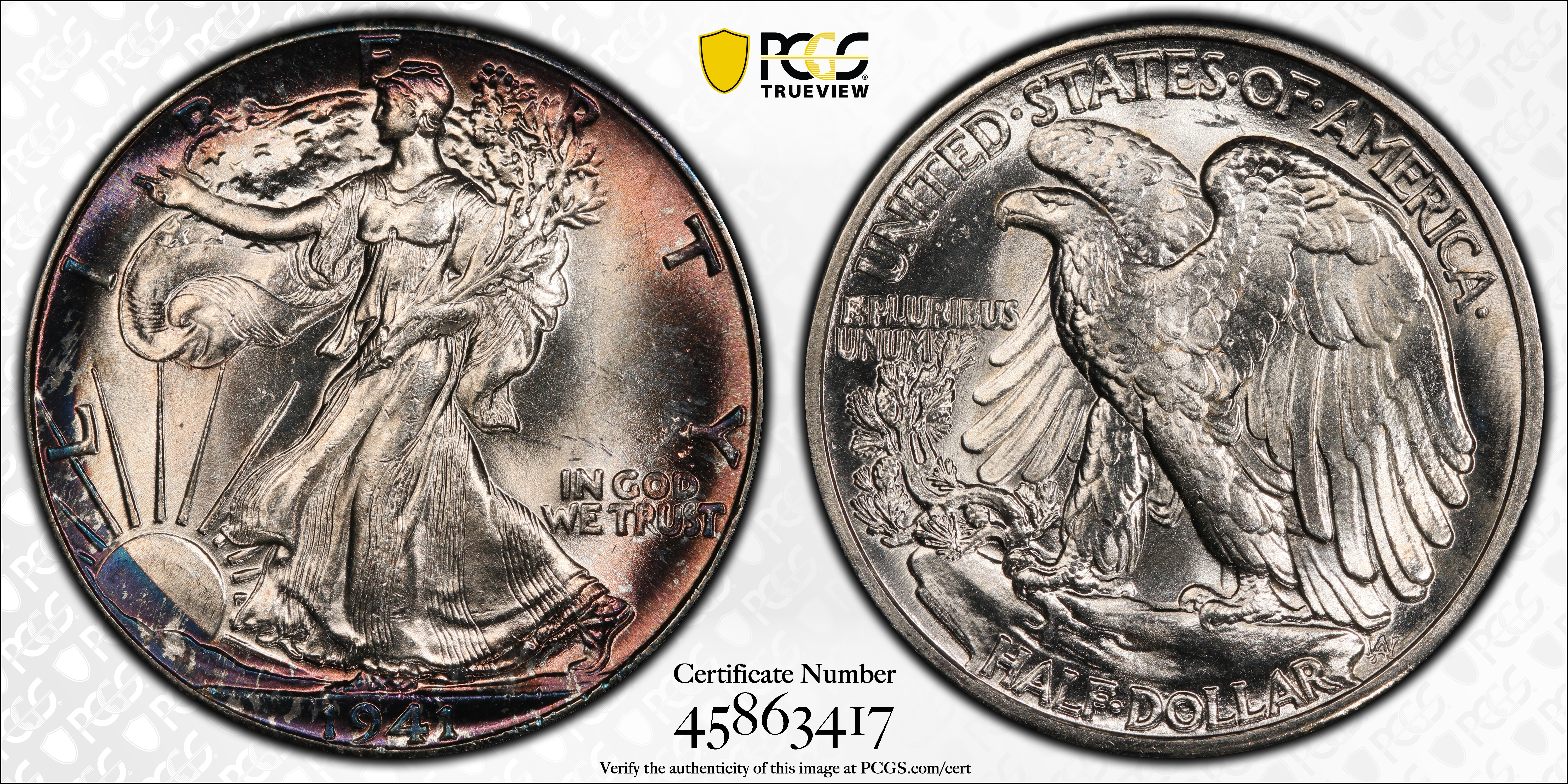 Starting in 1941 mintages for all Walking Liberty half dollars, especially the Philadelphia Mint issues, increase dramatically. As you might expect, survival rates increase because of this and also the fact the more coins were saved as the country came out of the Great Depression and a coin collecting boom began. The 1941 Philadelphia is one of the most common Walking Liberty half dollars in uncirculated and Gem condition. It is a little bit scarcer than the 1942 and 1943 but all three issues are "type" issues that do not sell for a premium price in any grade. The typical 1941 is very sharply struck. Luster can be white and frosty and toning runs from light golden iridescent to dark and dingy with everything in-between.