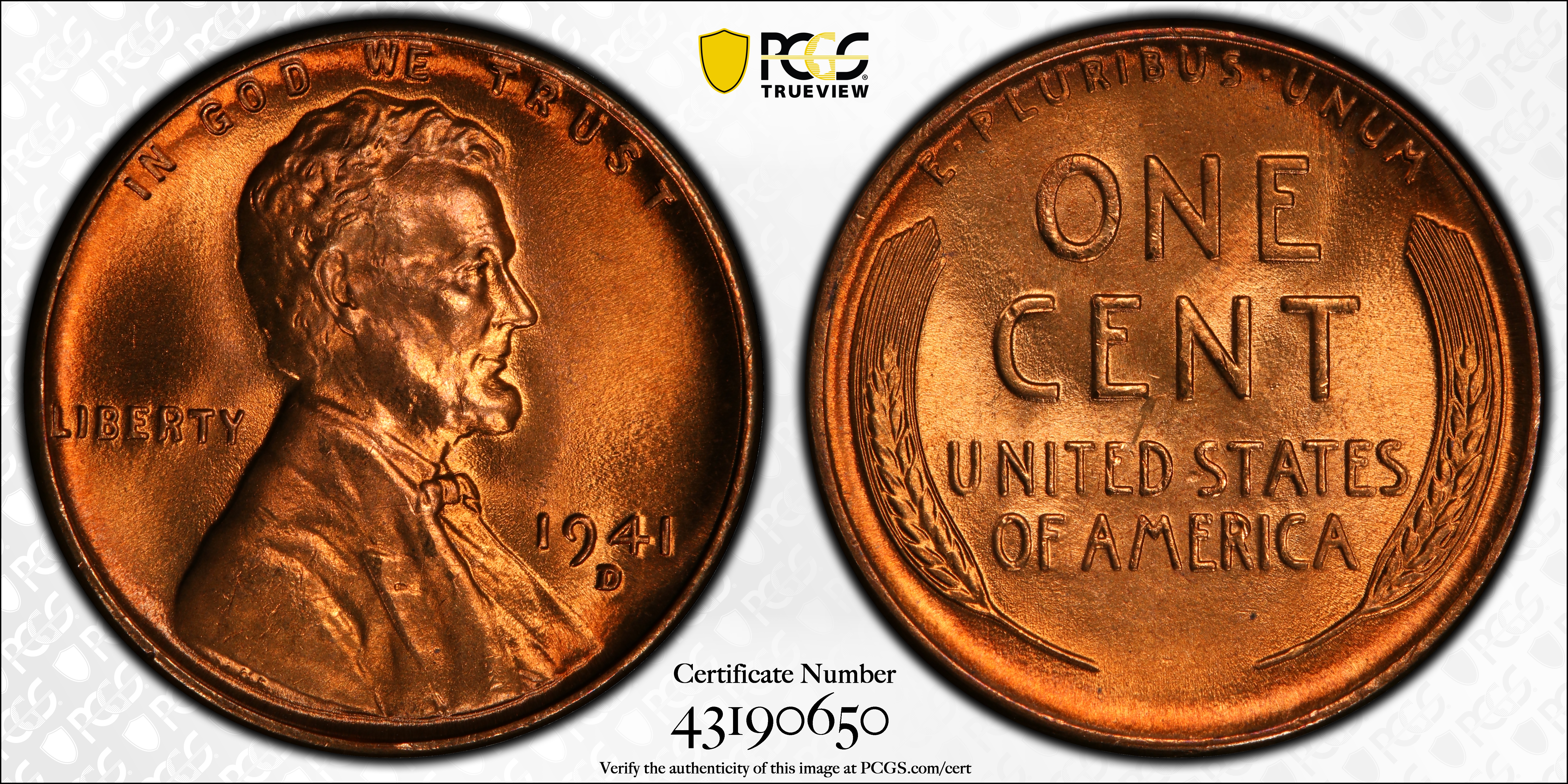 The 1941-D Lincoln Cent is very common in all grades. In fact, as of November 2011, PCGS listed nearly one thousand examples in MS-66 Red. The finest examples certified by PCGS are in MS-67 Red and those, too, can be found with relative ease. This date comes with a strong strike and great eye appeal.