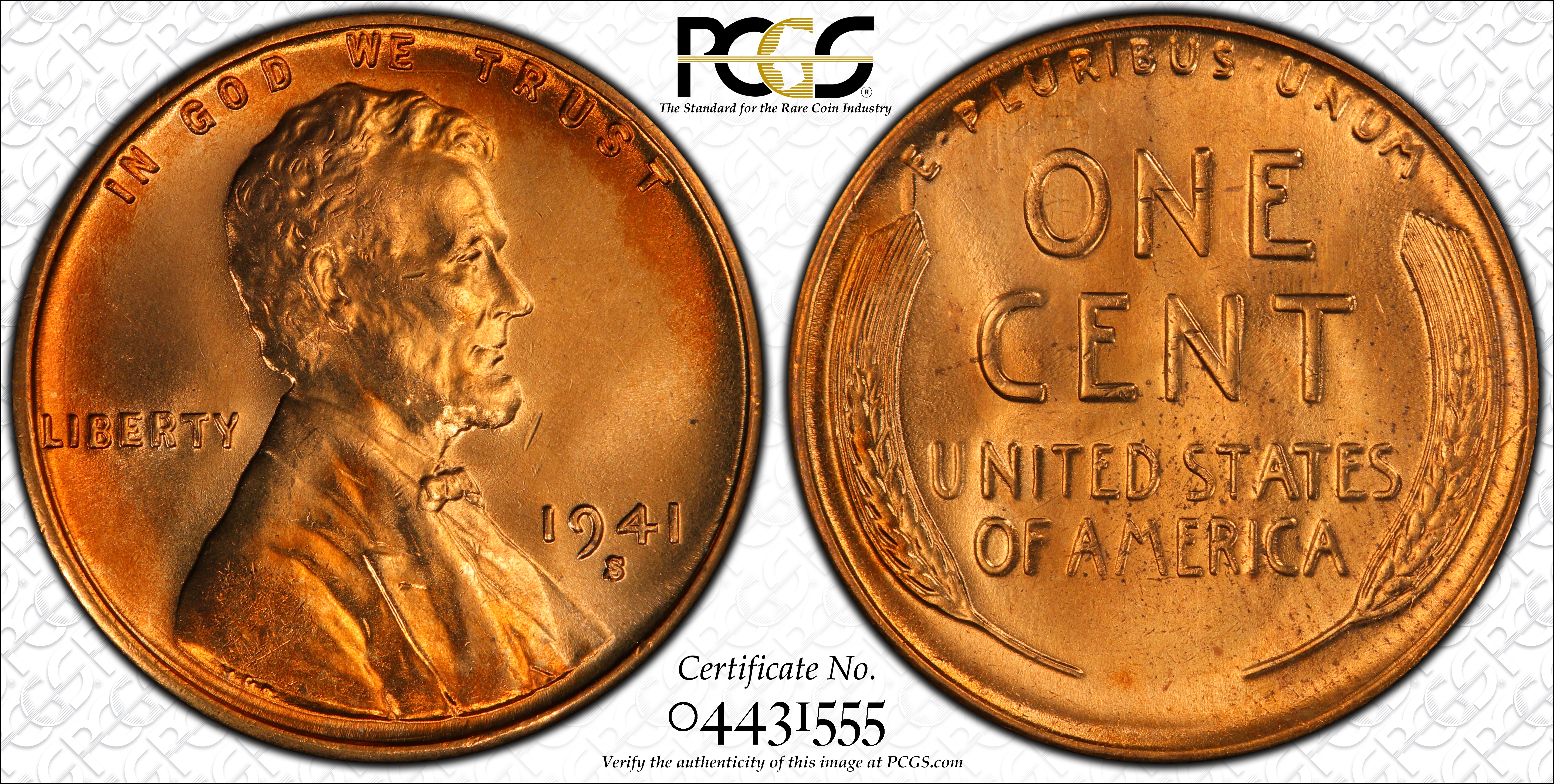 1941-S 1C, RD MS66RD Certification #04431555, PCGS #2701