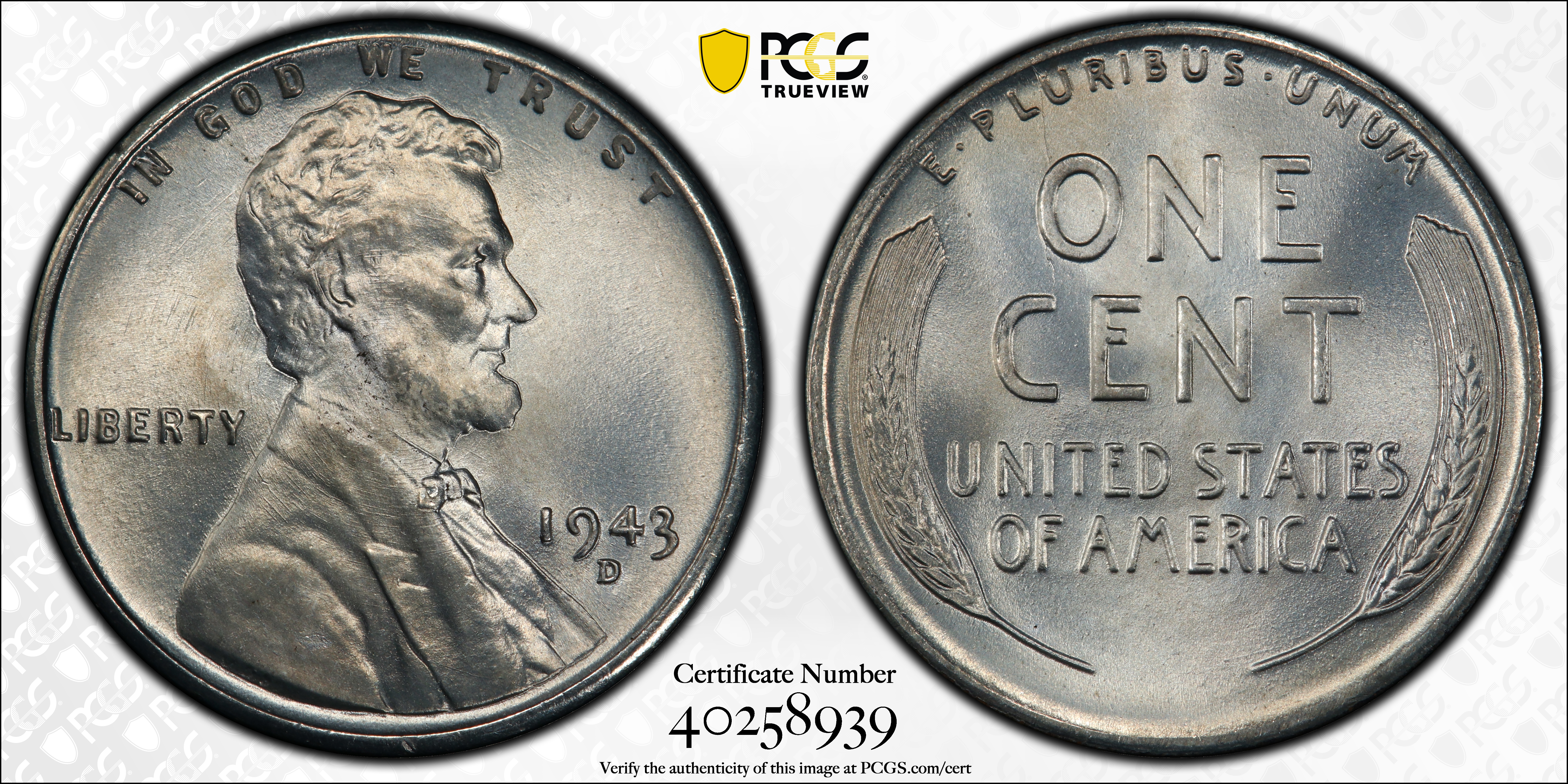 1943-D 1C MS67 Certification #40258939, PCGS #2714
