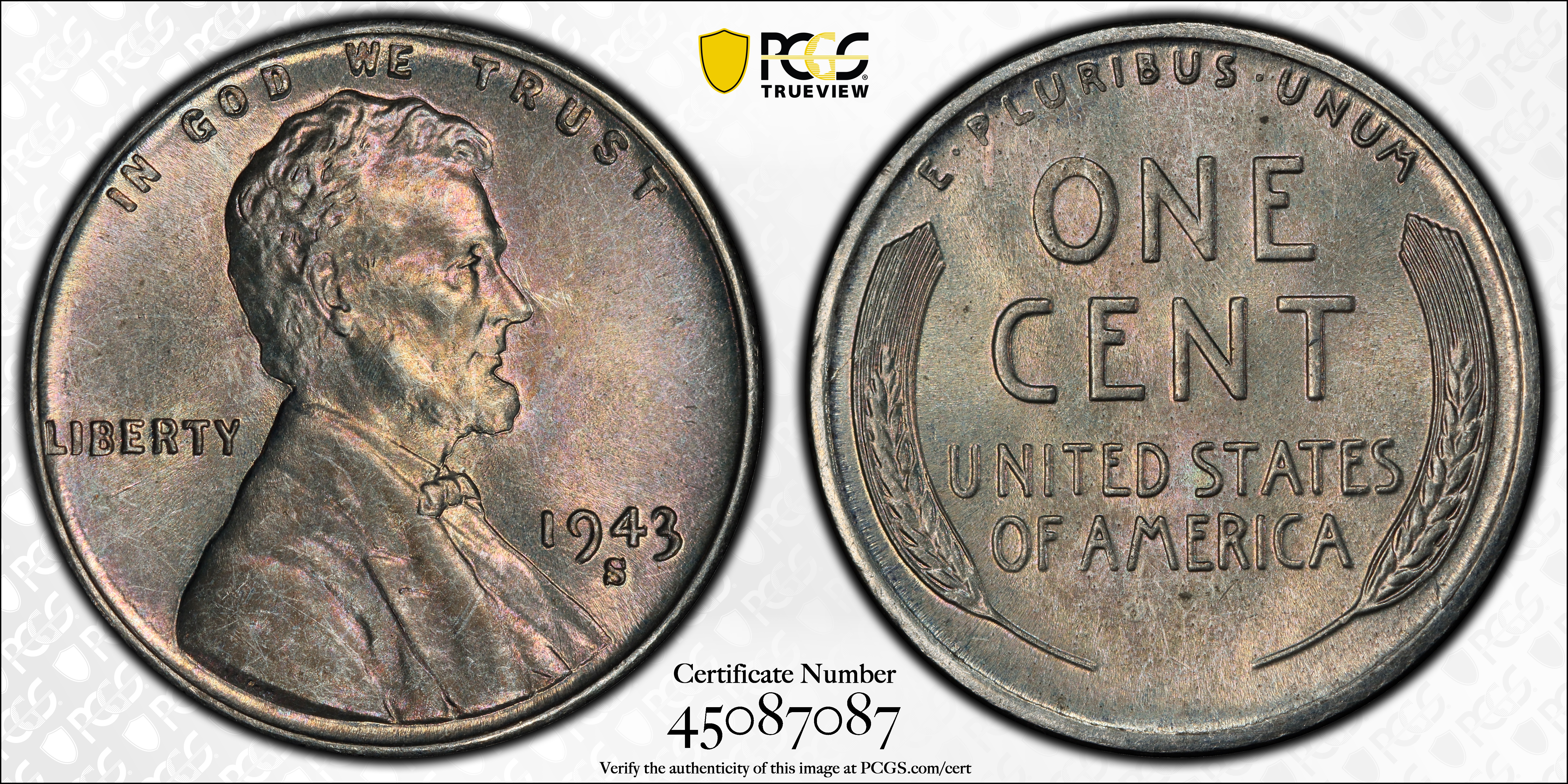 1943-S 1C MS65 Certification #45087087, PCGS #2717