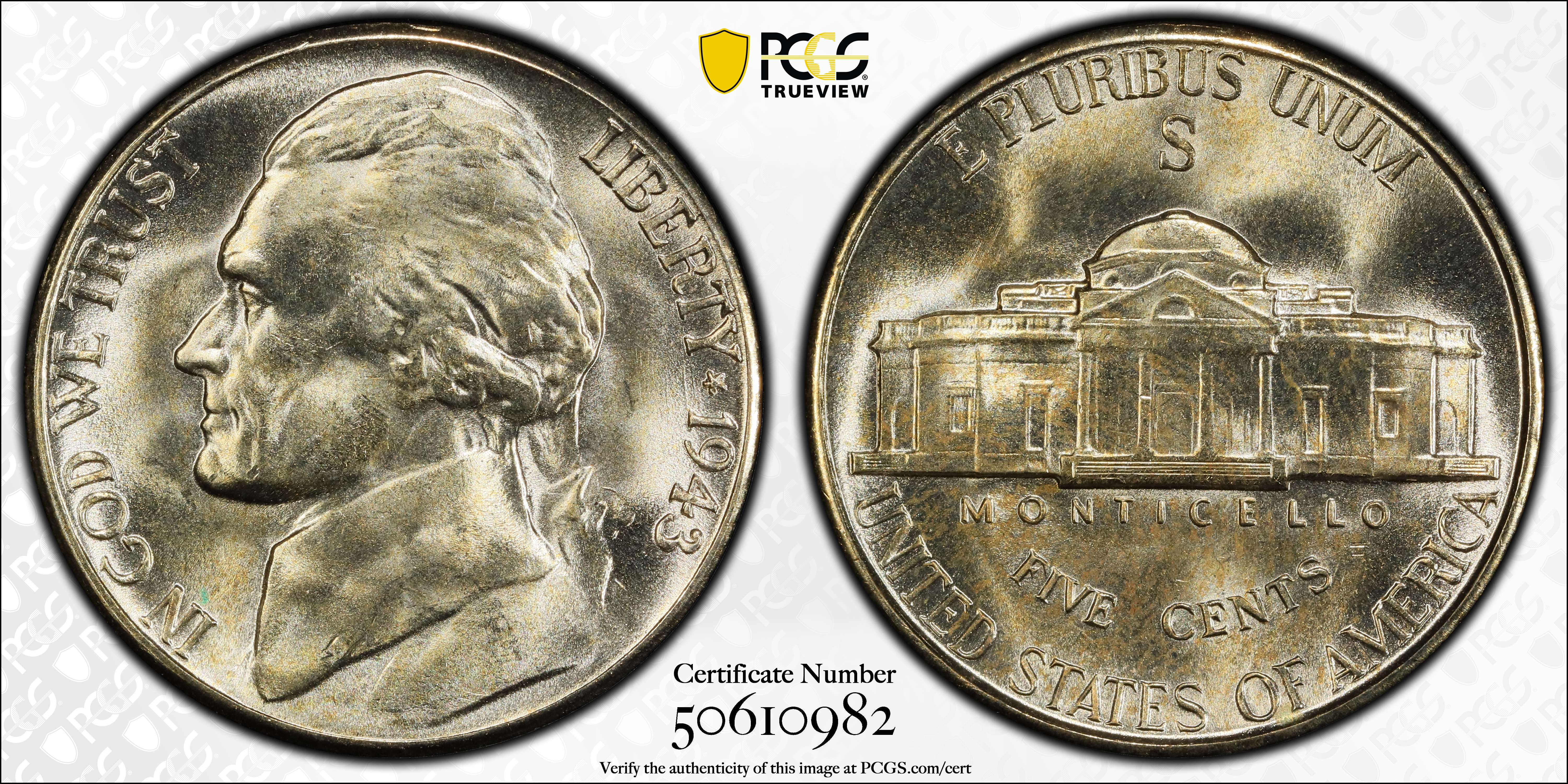 The 1943-S Jefferson Nickel is part of the series of War-time Silver Nickels that ran from mid-1942 to 1945. The Mint struck over 100 million pieces, many of which were saved in Uncirculated condition by collectors and accumulators. PCGS has graded thousands of Mint State examples, mostly in MS66. Likewise, 1943-S Nickels with Full Steps are fairly common, but still remain roughly 2-3 times as rare as non-Full Steps (at least among those that have been certified so far). None have been graded finer than MS67 by PCGS.
