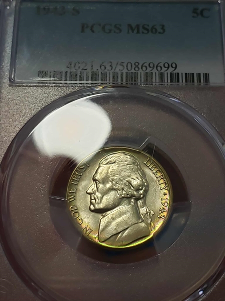1943-S 5C MS63 Certification #50869699, PCGS #4021